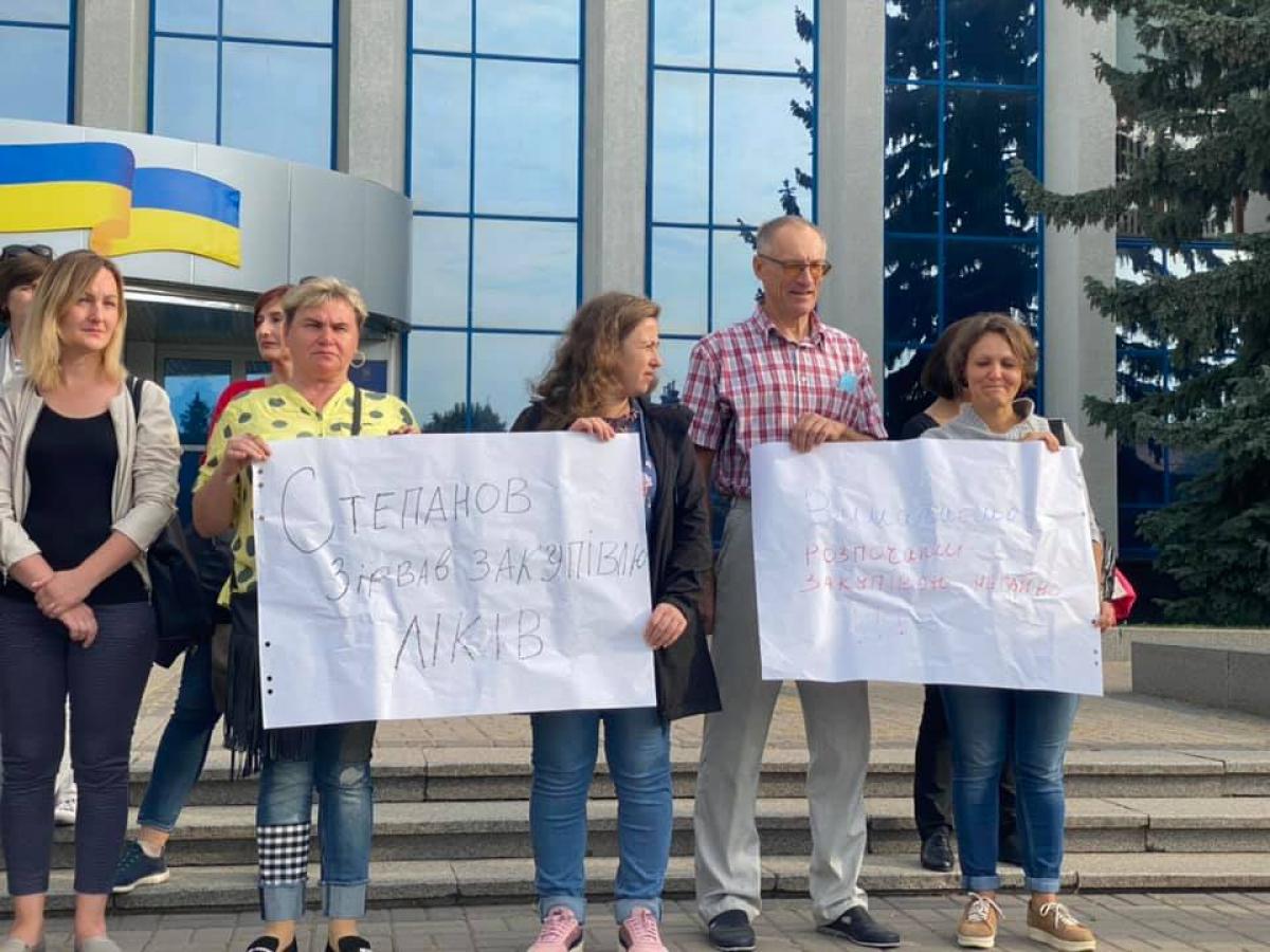 "Степанов зірвав закупівлю ліків" – з такими плакатами простестують люди.