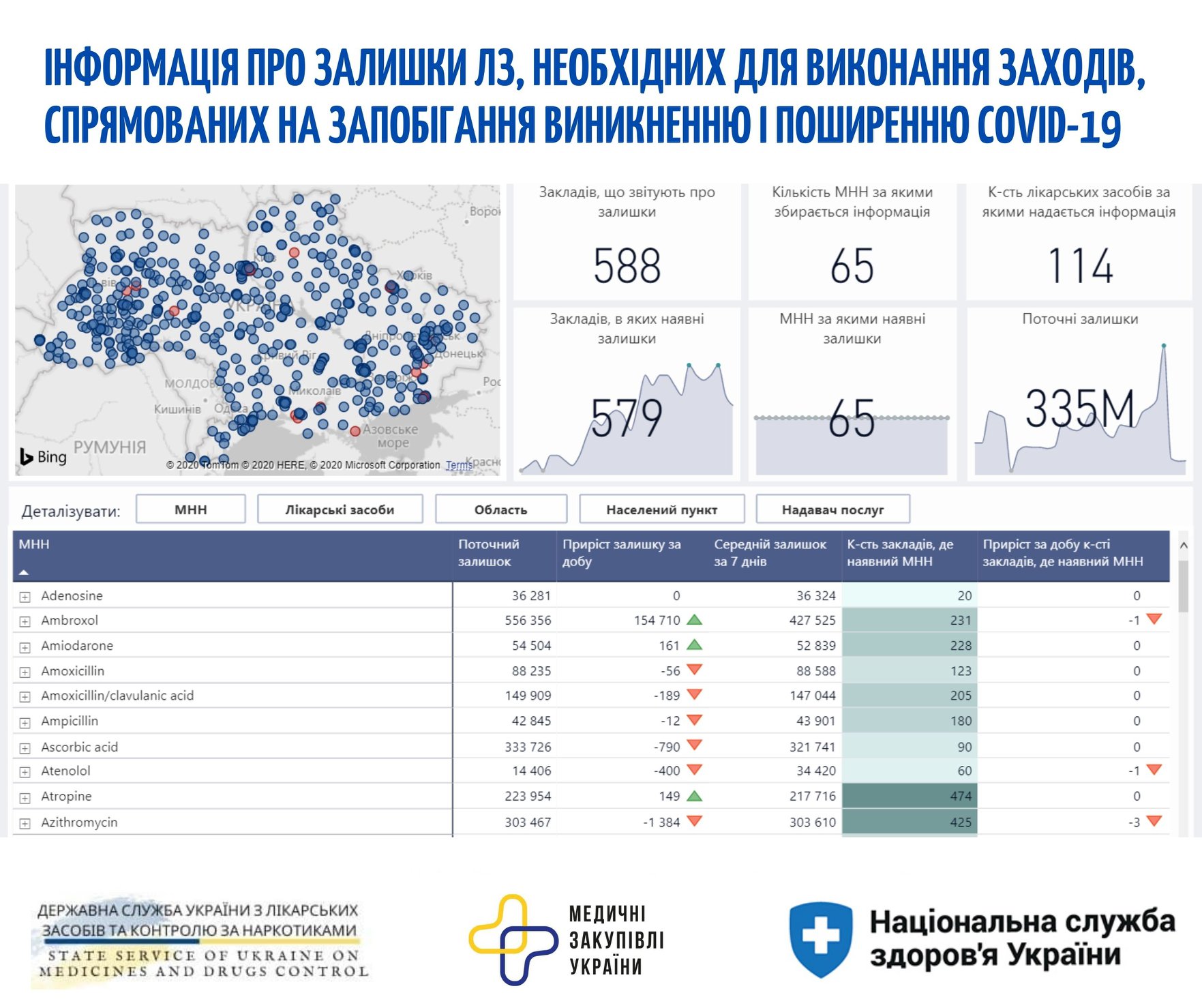 Щодо наявності залишків, необхідних для боротьби з COVID-19, в аптечних закладах, то відзвітували 2570 аптечних закладів. У них наявні 143 форми ліків, до складу яких входять 45 МНН.