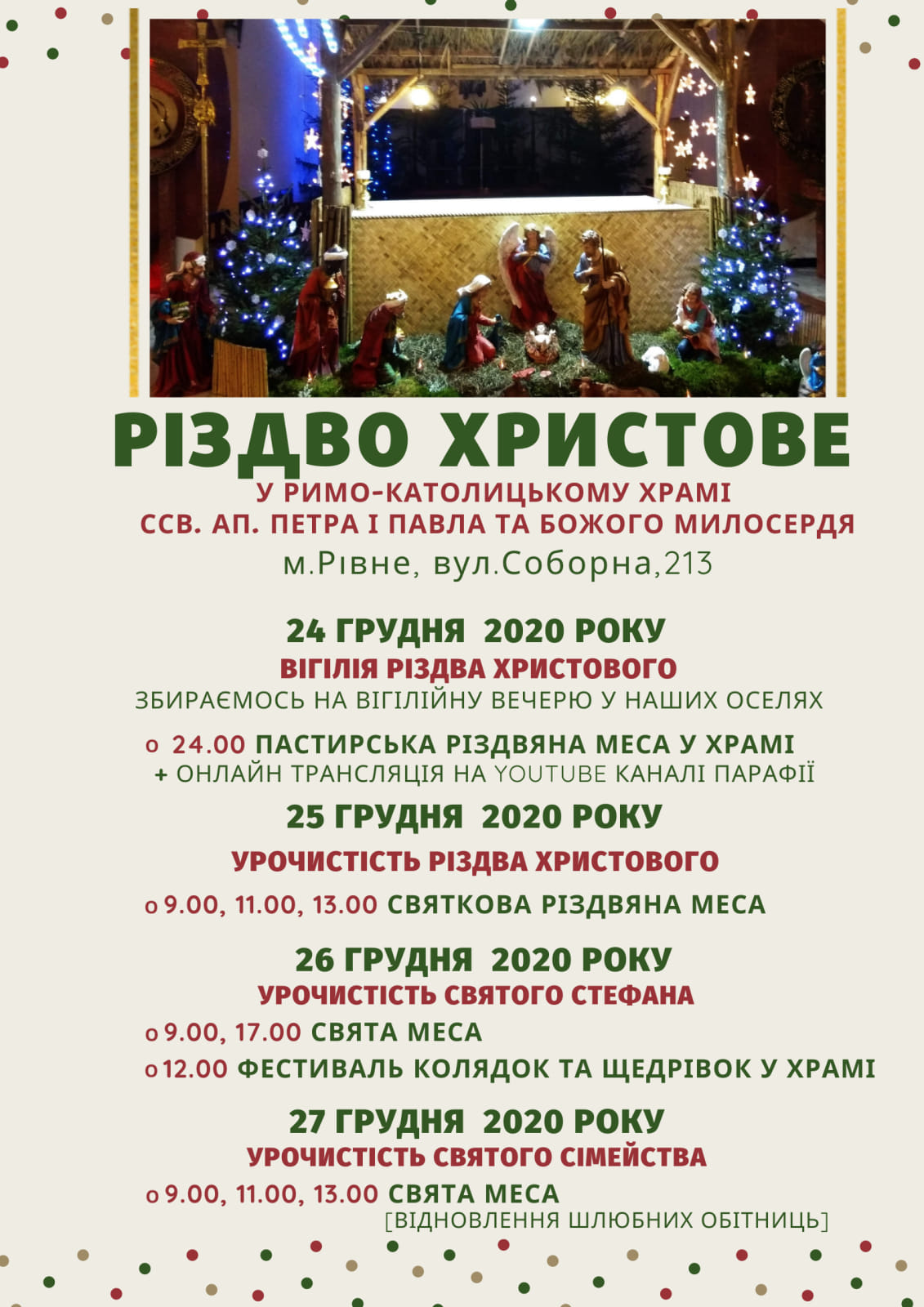 З вечора 24 грудня розпочнуться різдвяні богослужіння у храмі Римо-католицької парафії ссв. Петра і Павла та Божого Милосердя, що знаходиться у Рівному за адресою вул. Соборна, 213.