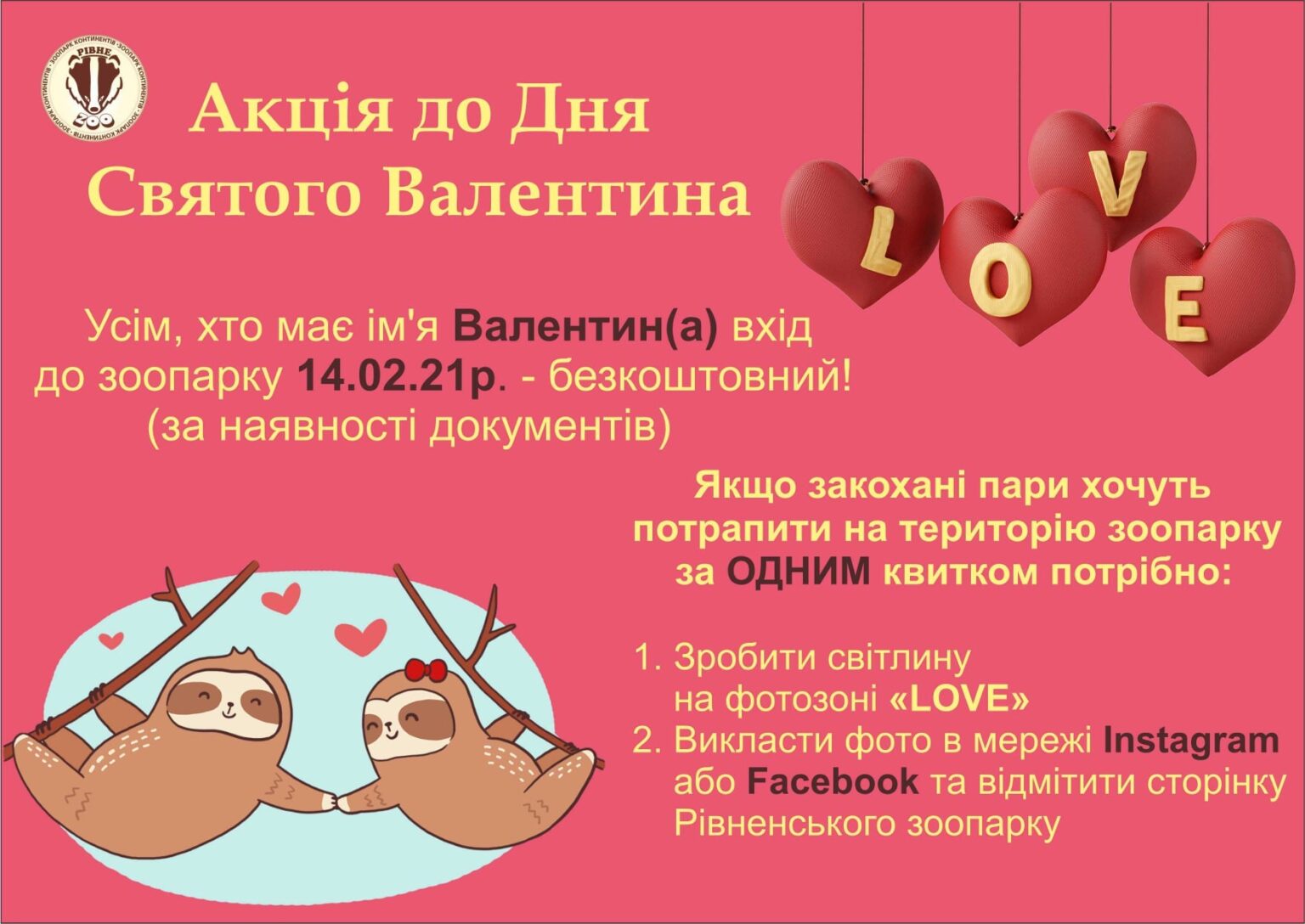 Закохані ж пари матимуть можливість потрапити до зоопарку за одним квитком. Для цього потрібно зробити світлину на фотозоні «LOVE», викласти фото в Instagram або Facebook та відмітити сторінку Рівненського зоопарку.