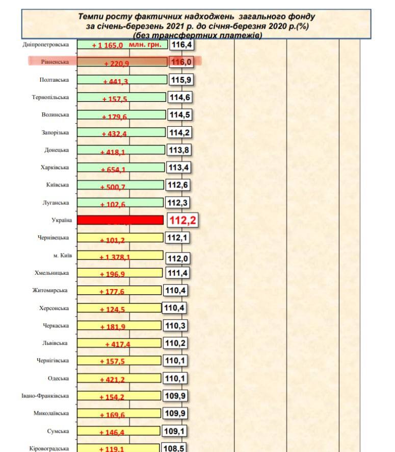 «Ми перші зі сплати ПДФО – плюс 163 мільйонів гривень, треті зі сплати за землю – плюс 12,8 млн та шості - з єдиного податку (+23 млн) та податку на нерухоме майно (+4,9). Загалом, до загального фонду місцевих бюджетів області надійшло понад 1,6 млрд грн власних доходів. Незважаючи на пандемію, продовжуємо тримати високу планку. Торік Рівненщина теж була в лідерах з виконання місцевих бюджетів», - зазначив Віталій Коваль.