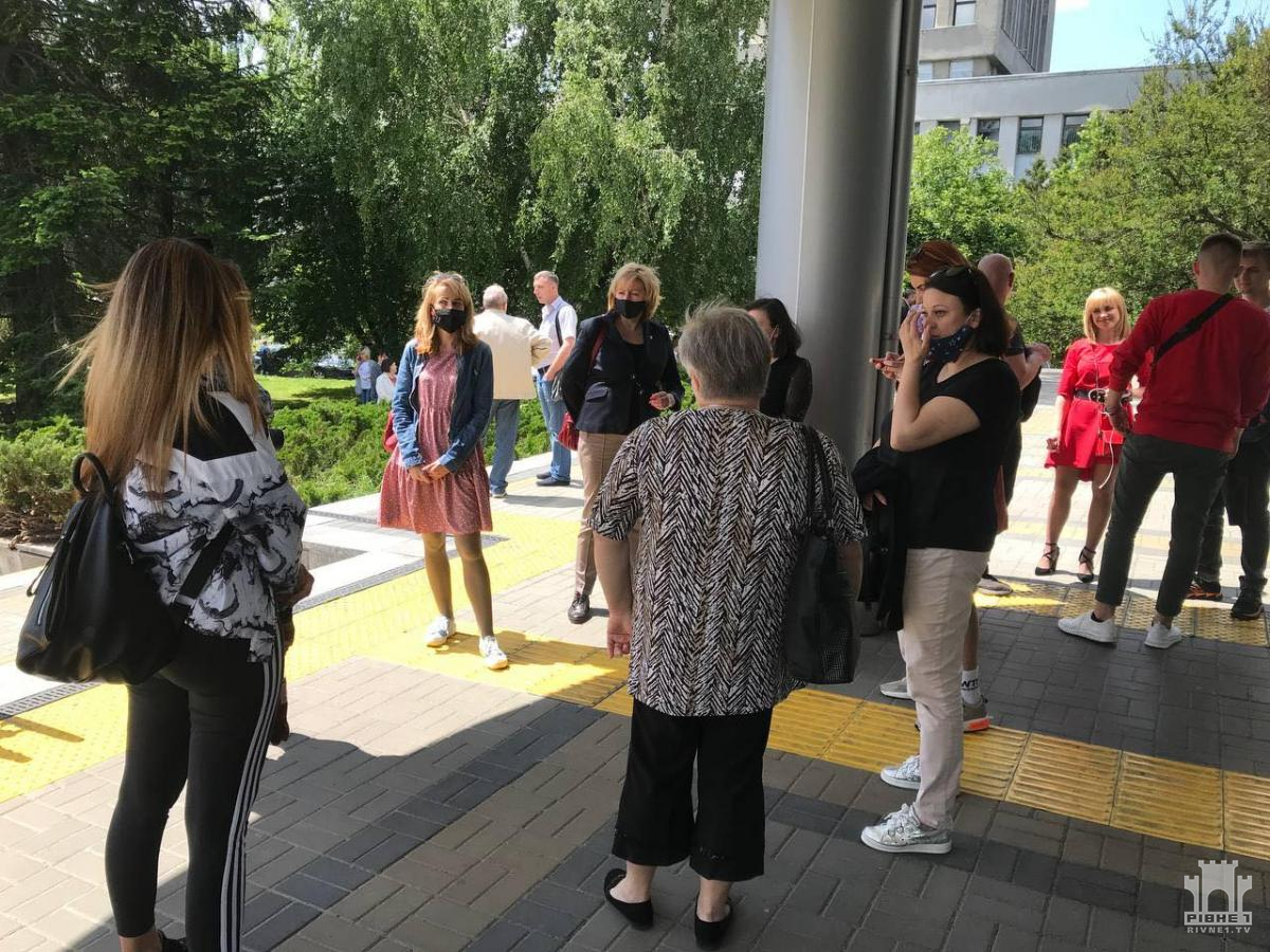 Перед позачерговою сесією Рівненської обласної ради зібралися медики. Згодом, вони зайшли в середину. Сесія триває.