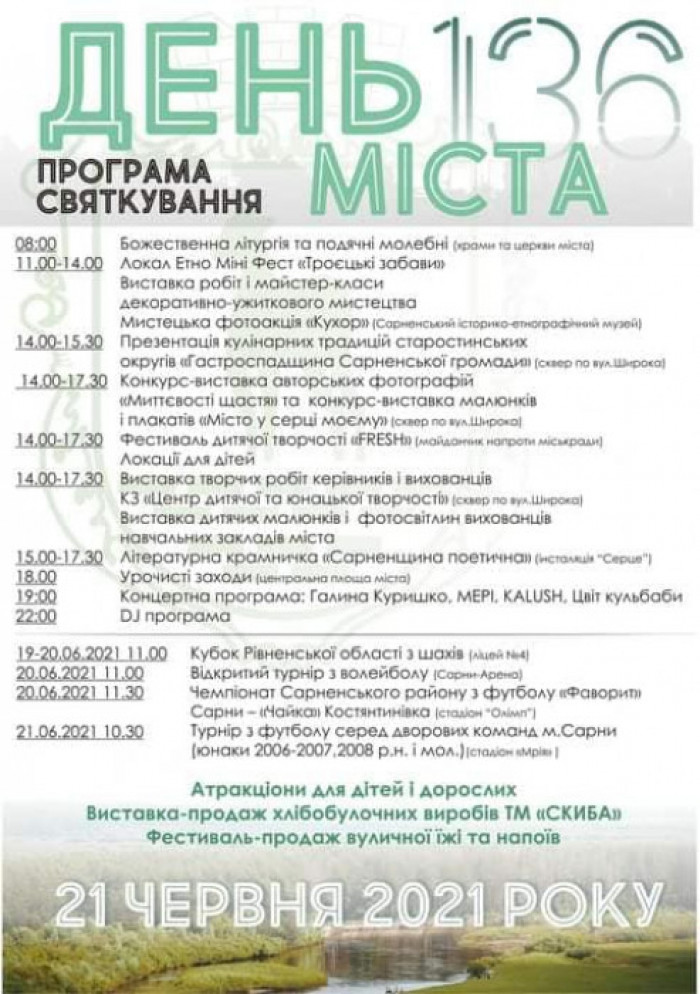 Упродовж дня на центральній площі Сарн запланували святкову програму з конкурсами, виставками та великим концертом.