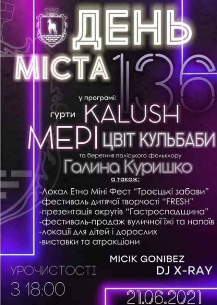 О 19:00 розпочнеться виступ талановитої сарненчанки, учасниці «Голосу країни» Галини Куришко, а також гуртів «Мері», «Цвіт кульбаби» та «Kalush». О 22:00 запланована DJ програма.