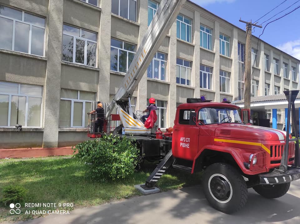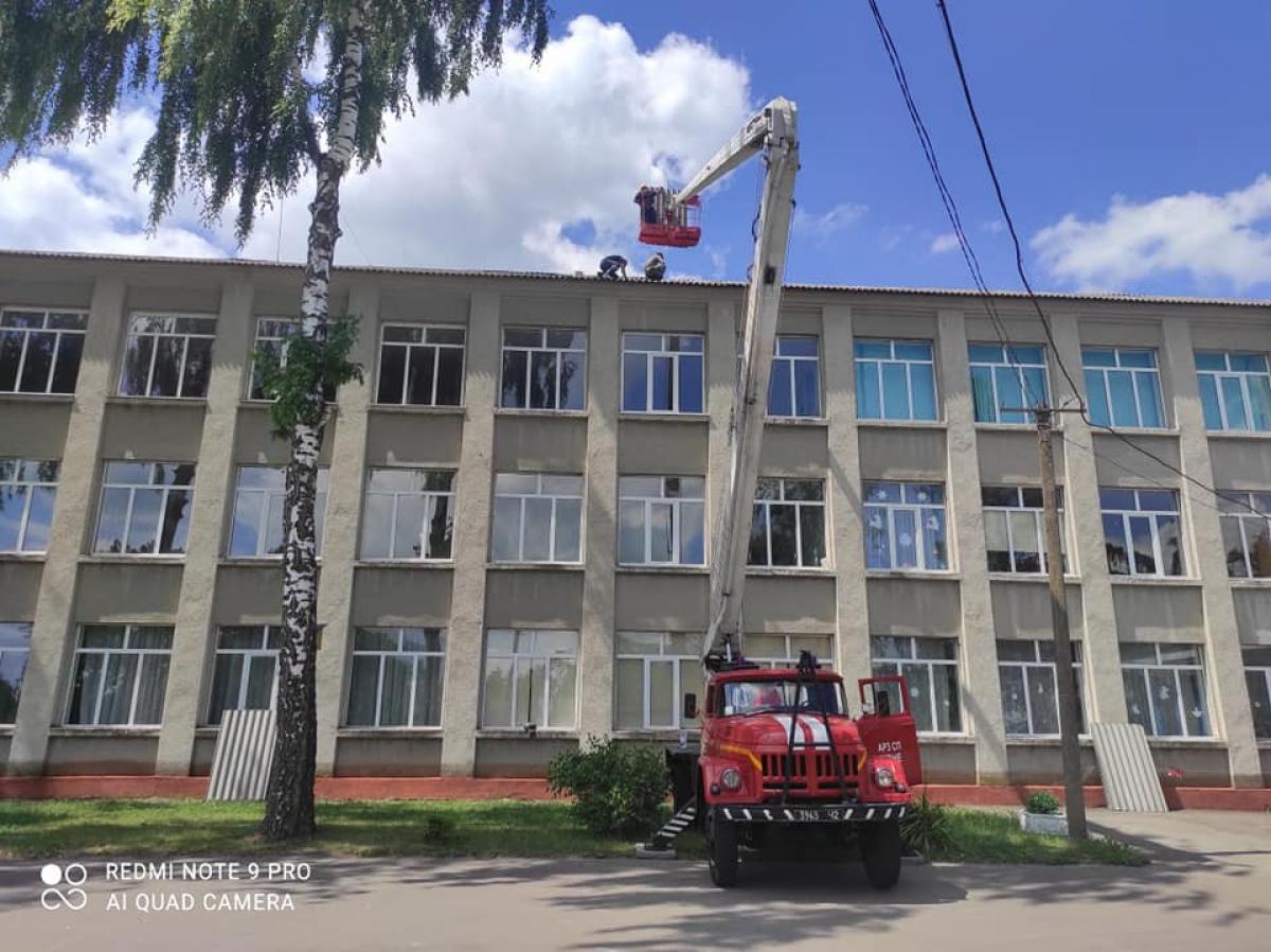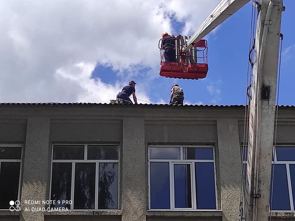 За допомогою колінчатого підйомника аварійно-рятувального загону спеціального призначення ГУ ДСНС України у Рівненській області було здійснено часткову заміну шиферу даху зірваного внаслідок буревію 25 червня.