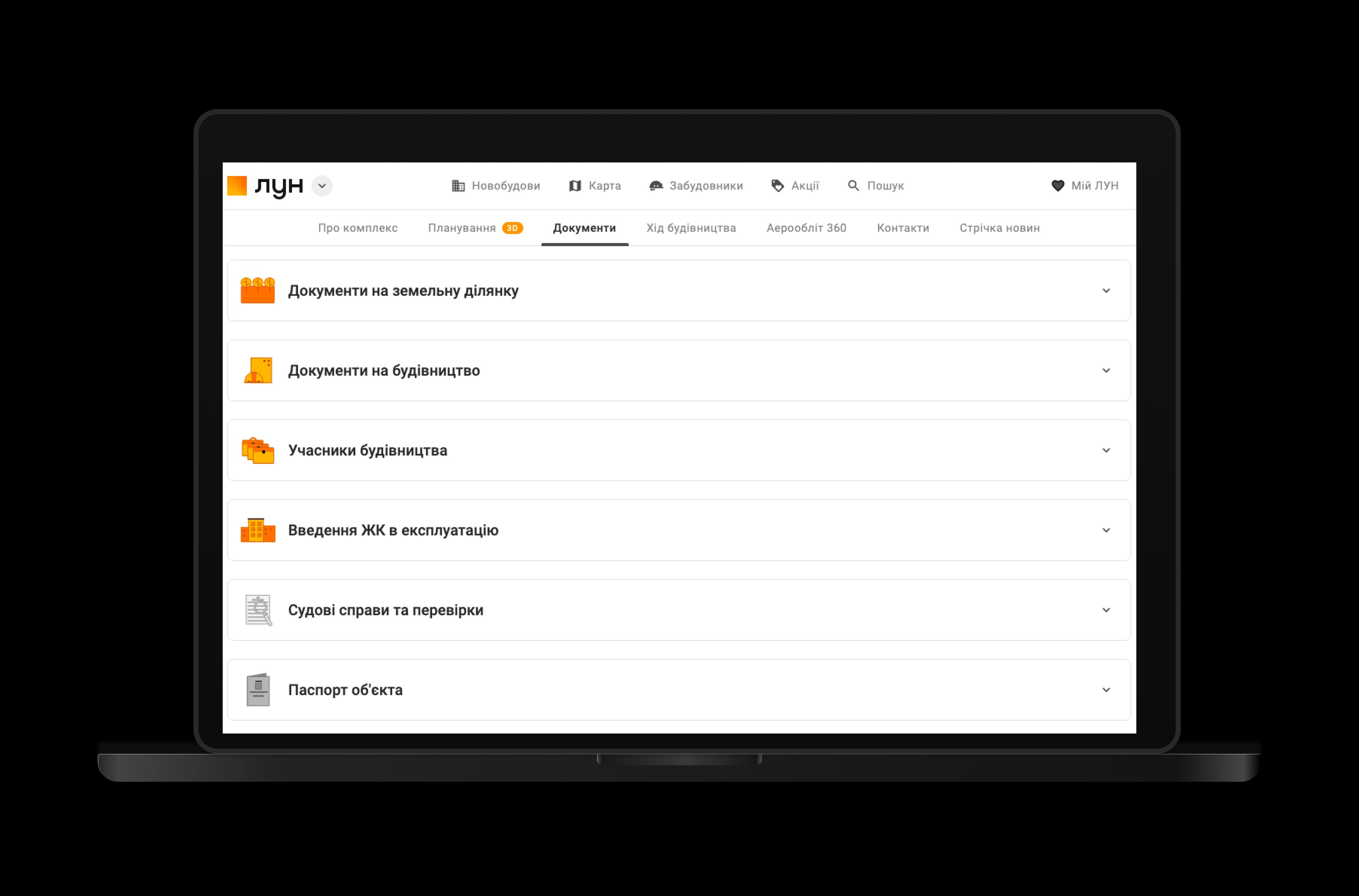 Заходите на сайт lun.ua, обираєте новобудови Рівного, переходите на сторінку вподобаного житлового комплексу і тиснете на кнопку «Документи». Якщо певного документу немає, то його блок позначений сірим кольором – як не заповнений. Також зверніть увагу на розділ «Судові справи та перевірки» – у новобудови без проблем він має бути порожнім.