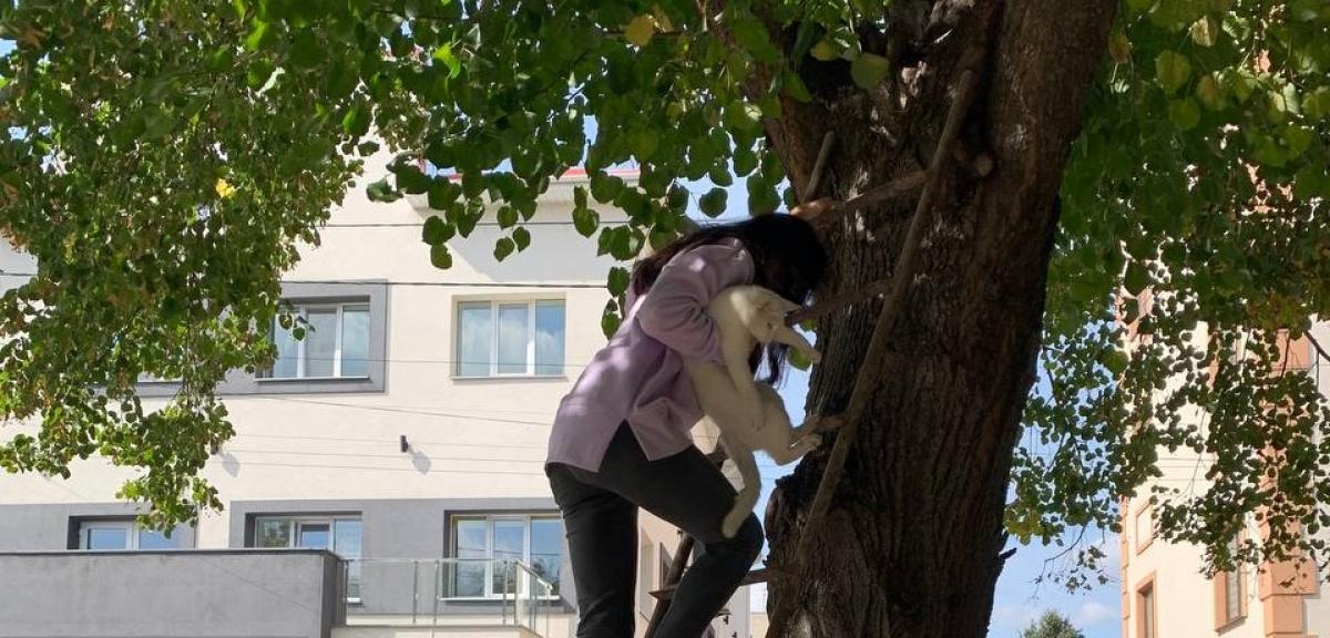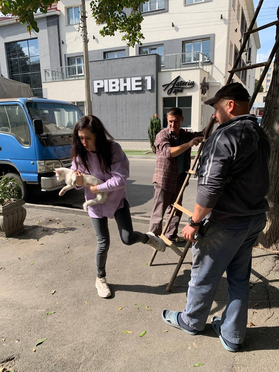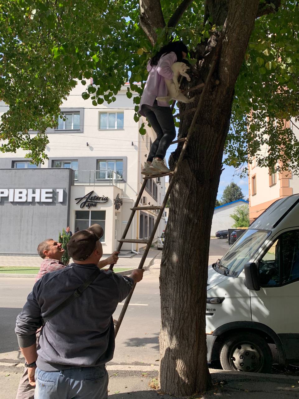 Наляканий собаками кіт вискочив на дерево та не міг злізти самостійно. Небайдужі рівняни знайшли драбину та врятували чотирилапого.
