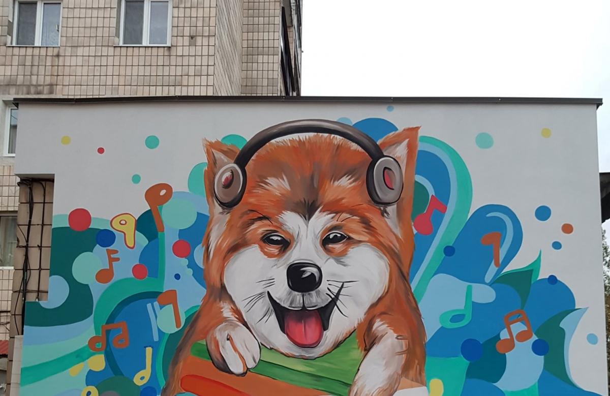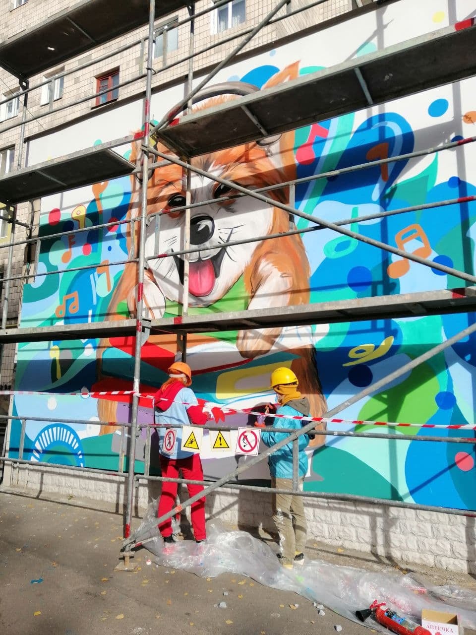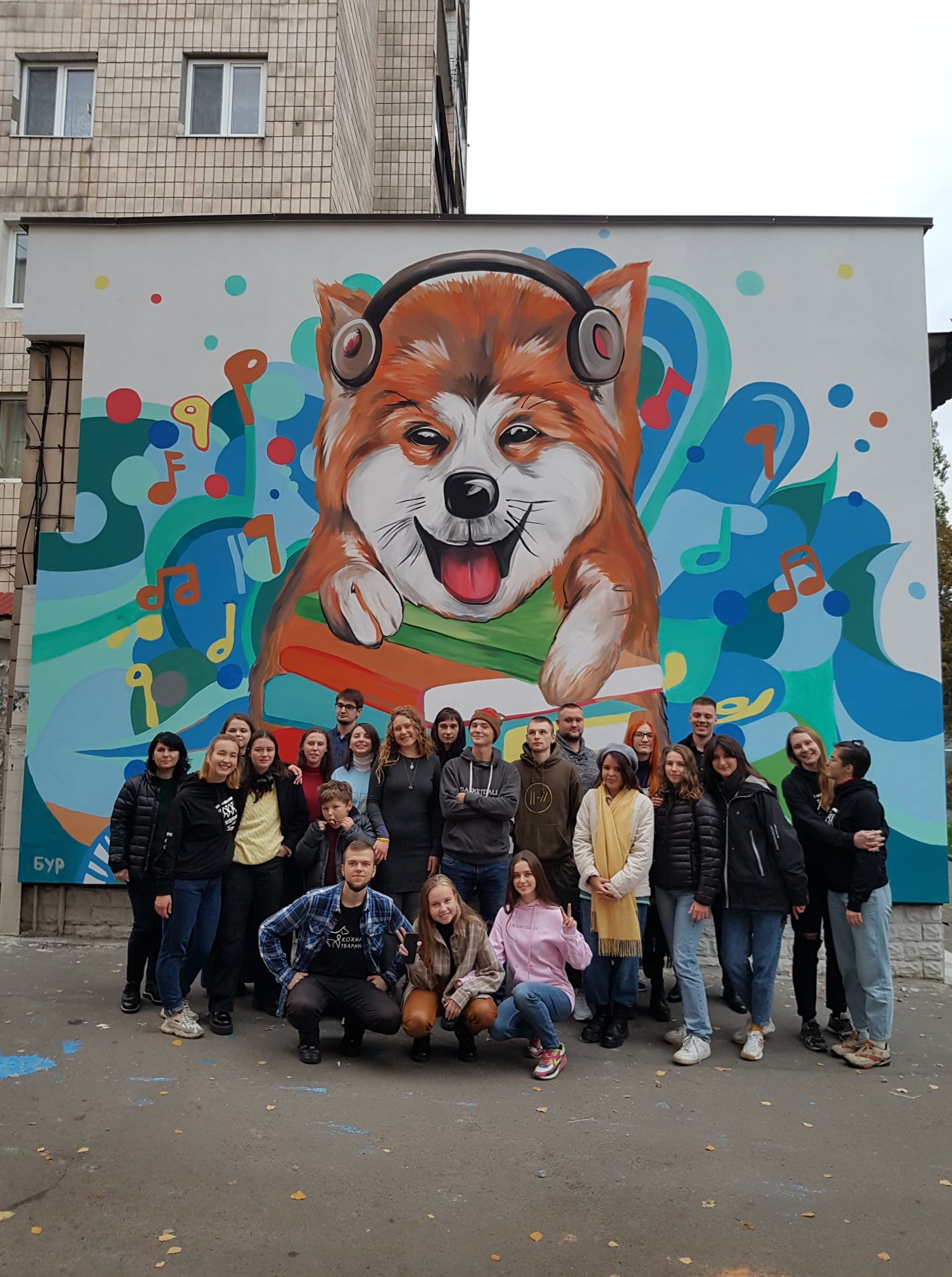 Першим кроком стала підготовка стіни перед початком робіт. Намалювавши контури песика, волонтери продовжили насичувати стіну кольорами. Клопітка робота художників радує око відвідувачів молодіжного простору та всіх жителів області..jpg)