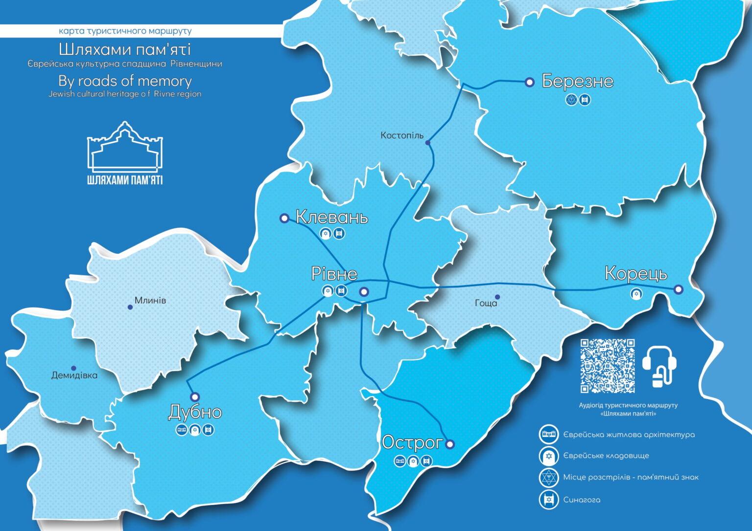 Також створено аудіогід українською та англійською мовами, тактильну копію зруйнованої синагоги в місті Березне та каталог єврейського кладовища в Острозі.