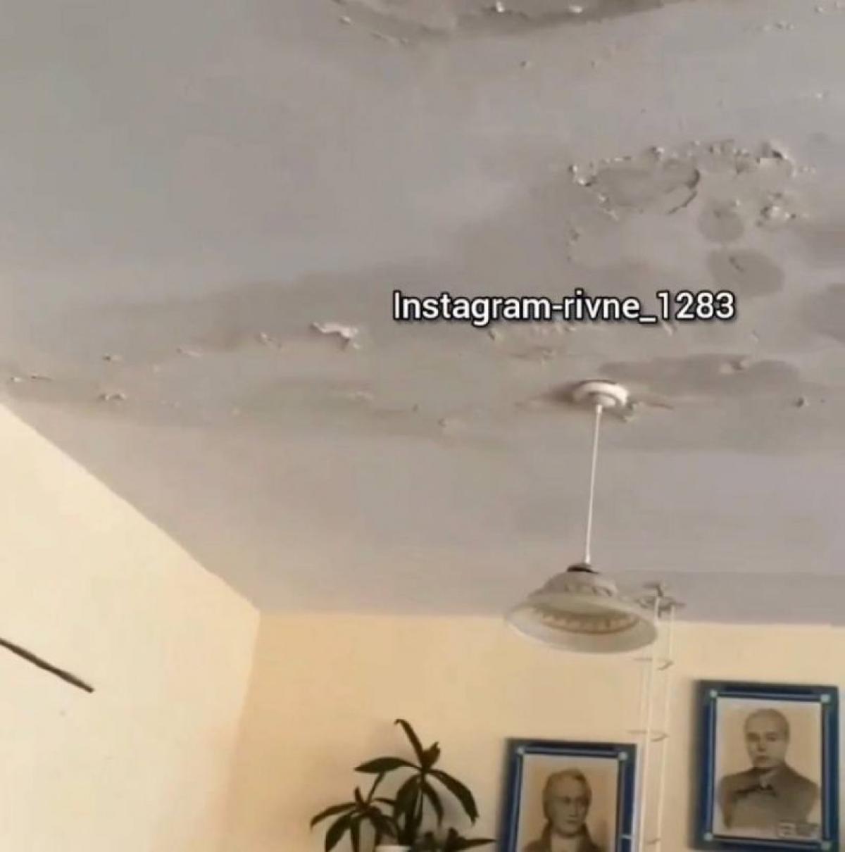 На відео видно , як у 11-ій школі, що Рівному з потрісканої стелі тече вода. На підлозі стоїть відро, в яке капає вода.