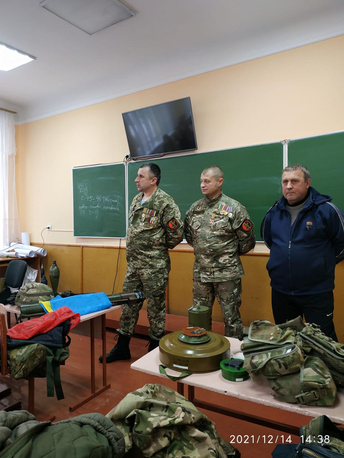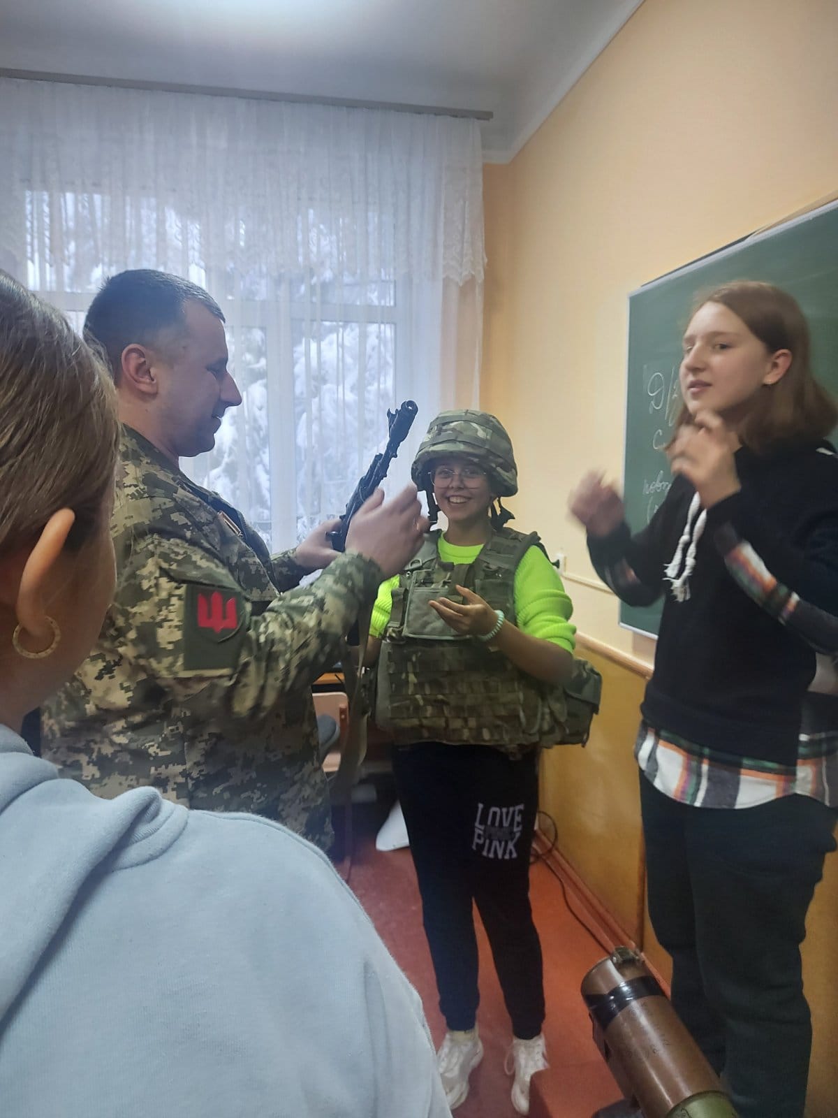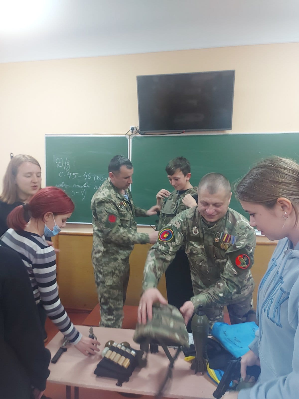 Розповіли діткам про бойовий шлях воїнів , про волонтерську роботу. Також ознайомили з зразками зброї та індивідуального захисту. Кожен бажаючий з учнів , мав змогу приміряти на себе бронежилет, шолом , та потримати в руках зброю .
