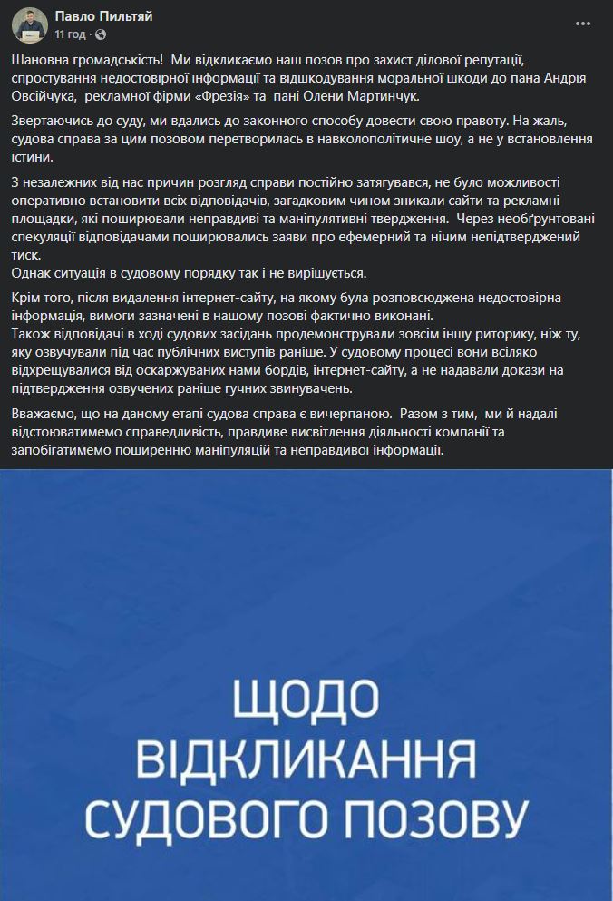 Шановна громадськість! Ми відкликаємо наш позов про захист ділової репутації, спростування недостовірної інформації та відшкодування моральної шкоди до пана Андрія Овсійчука, рекламної фірми «Фрезія» та пані Олени Мартинчук.
