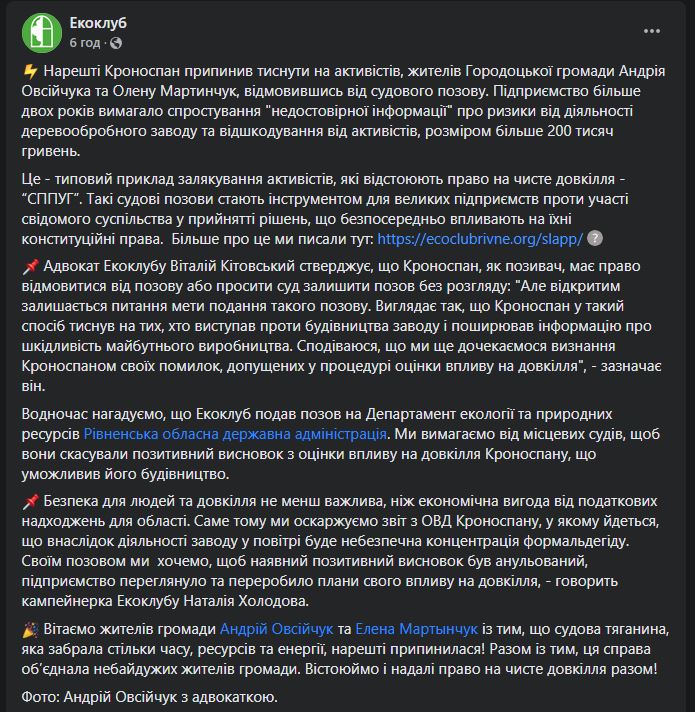Нарешті Кроноспан припинив тиснути на активістів, жителів Городоцької громади Андрія Овсійчука та Олену Мартинчук, відмовившись від судового позову. Підприємство більше двох років вимагало спростування "недостовірної інформації" про ризики від діяльності деревообробного заводу та відшкодування від активістів, розміром більше 200 тисяч гривень.