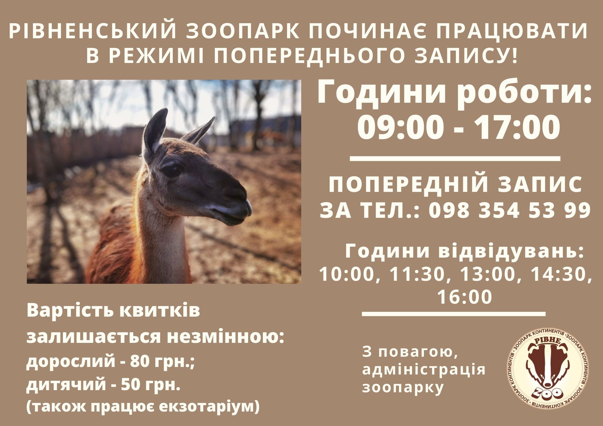 Зоопарк працює в режимі попереднього запису (не більше 30 осіб на вказаний час) за тел.: 098 354 53 99.