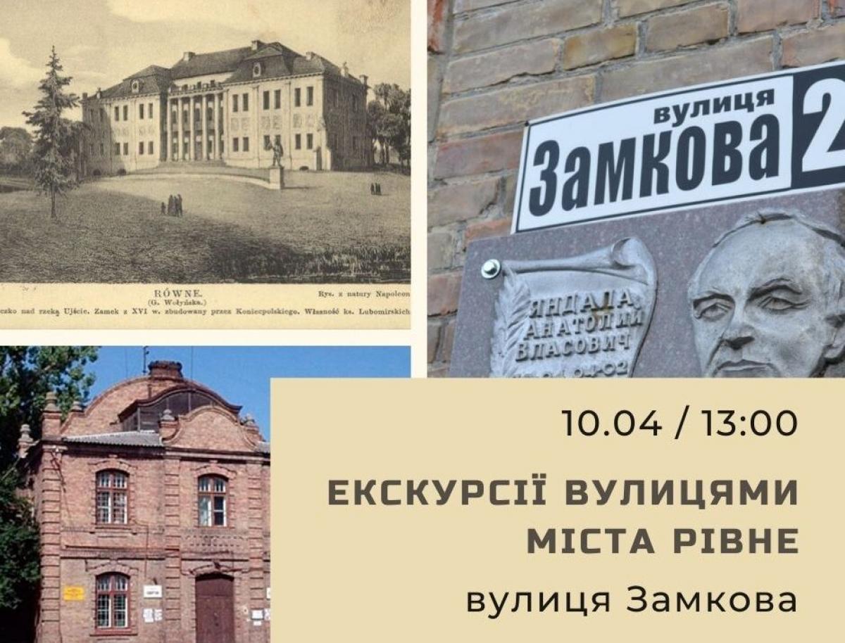 “Вулиця Замкова є унікальною частинкою біографії нашого міста. Екскурсія-мандрівка розпочинається з середньовічної історії Рівного: з озера у парку Молоді. Мешканці міста, які полюбляють відпочивати та прогулюватися в ньому, й гадки не мають, що тут, серед колись широких рівненських ставків понад півтора століття тому розкинувся небачений палацово-парковий ансамбль. А ще раніше на цьому місці височів замок зведений засновницею міста Марією Несвицькою. Екскурсанти мають можливість дізнатися про походження назви вулиці, про засновницю міста Марію Несвицьку (Рівненську), про резиденцію магнатського роду Любомирських та його представників. Також ви побачите будинок, в якому в 1912 р. була відкрита приватна електростанція князя Станіслава Любомирського, відчуєте архаїчний колорит вулиці, що починалася від замку.