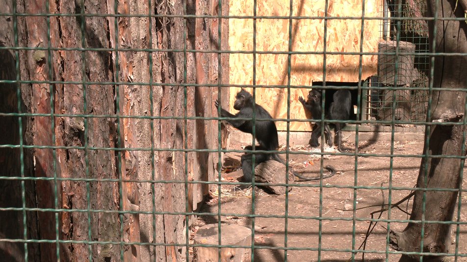 Для мавп з Київщини облаштували вольєри з обігрівачами. Тут живе родина чорних мангабеїв. Серед евакуйованих з зоопарку “12 місяців” 16 мавп – колобуси, мартишки і тамарини. Вони перебували в облозі й не мали що їсти, мавп під обстрілами вивозили через річку.