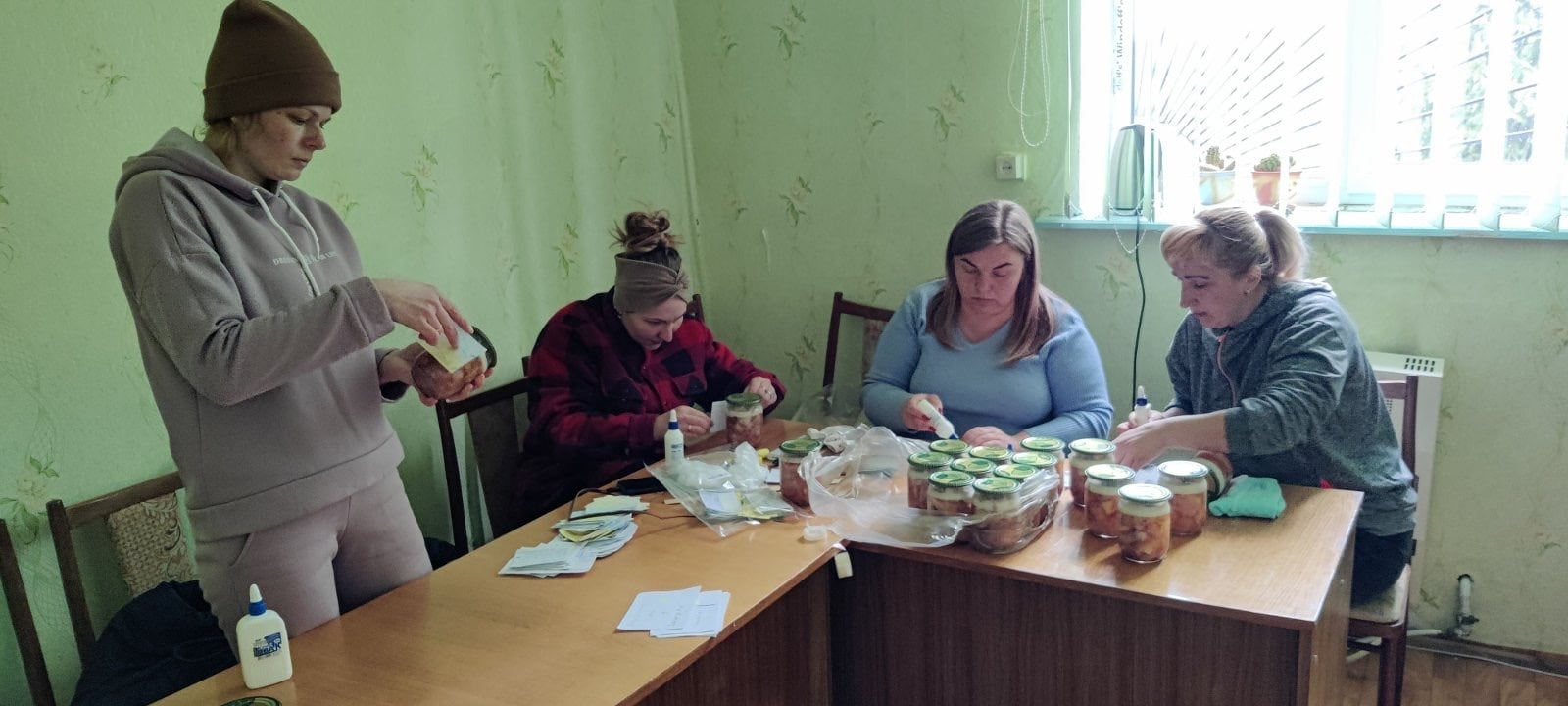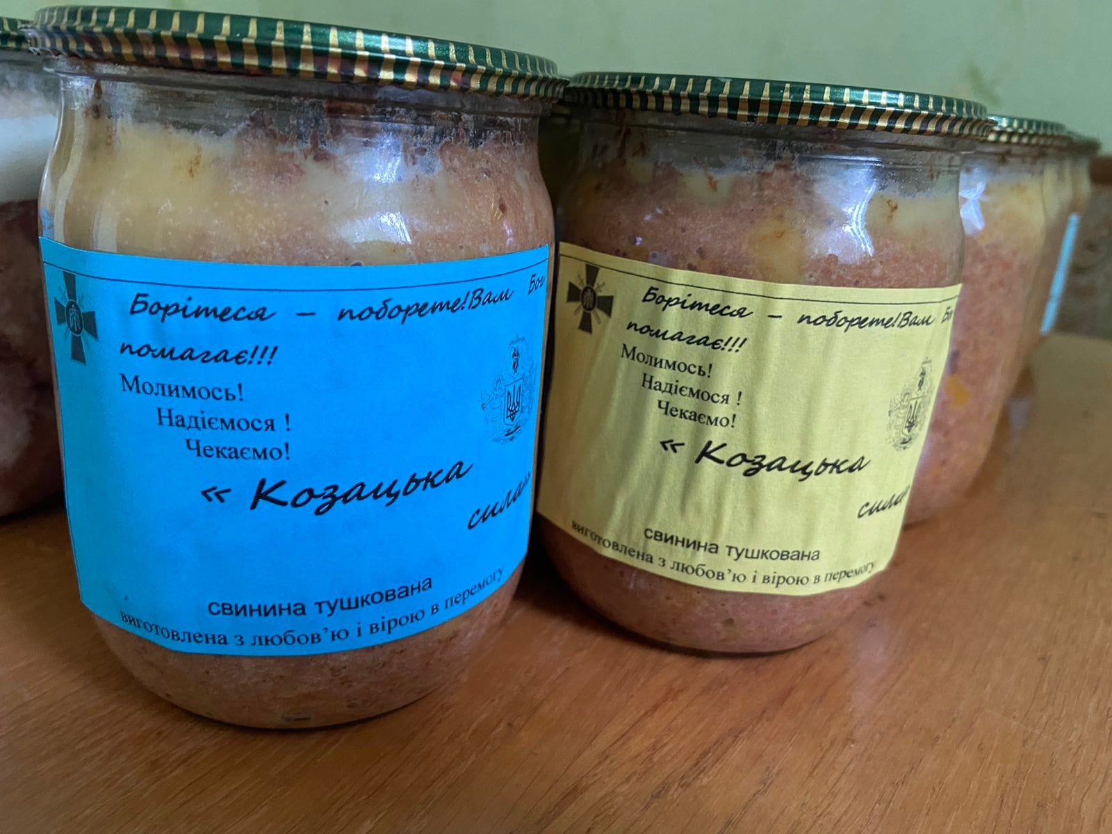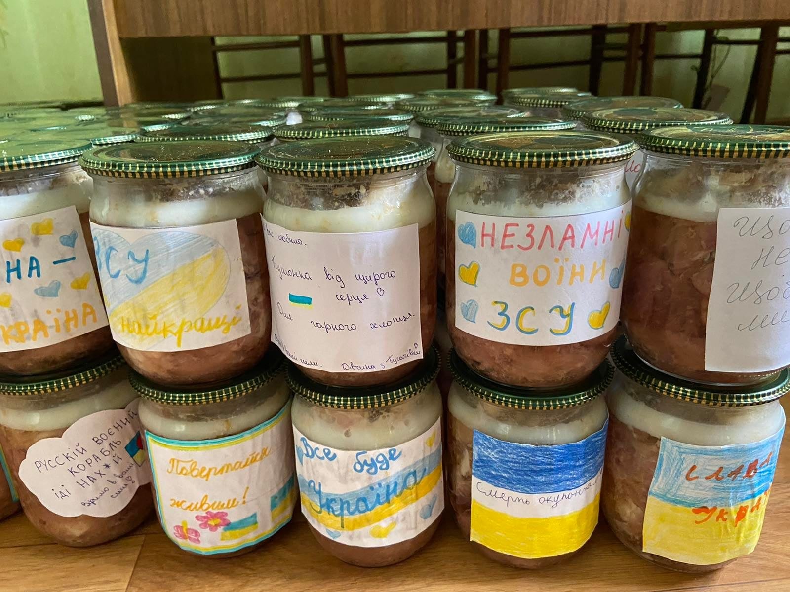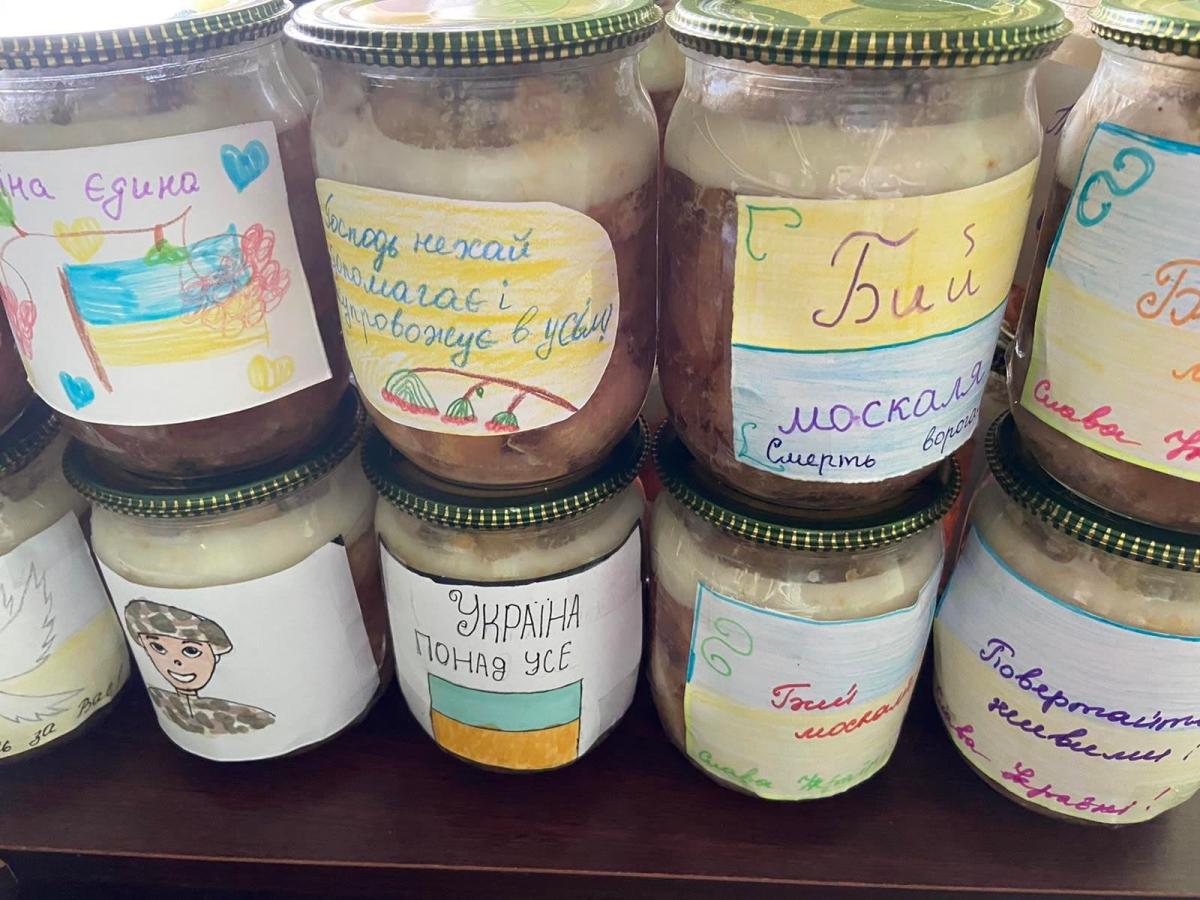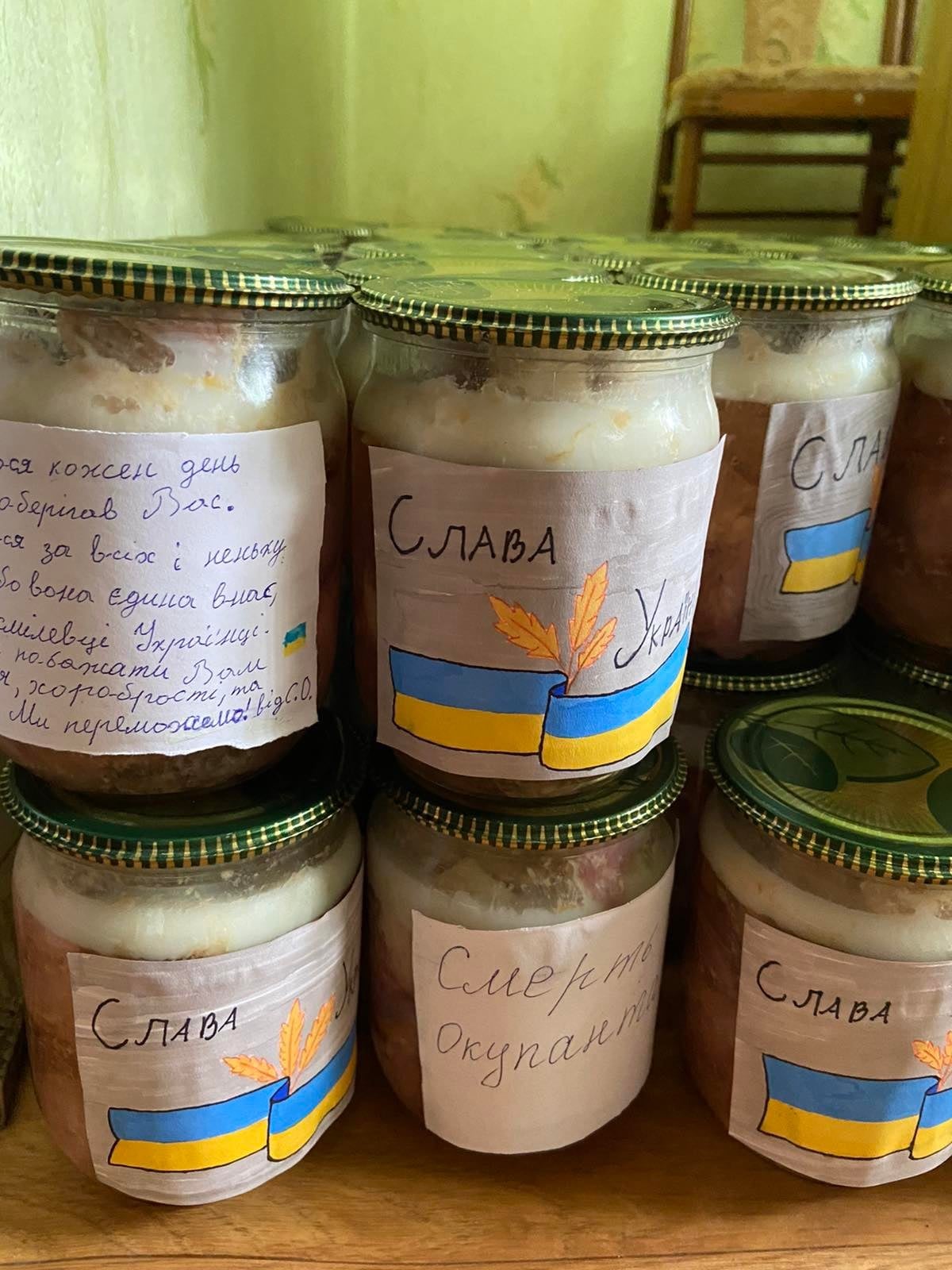 Спільними зусиллями вдалось приготувати пів сотні банок тушкованки з патріотичними етикетками. Кожна етикетка - унікальна, бо підписана вручну кожною господинею особисто.