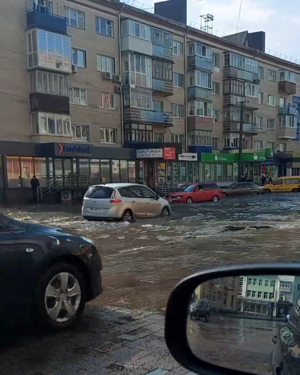 Через затоплення навіть пішоходи на тротуарах змушені долати водні перепони.