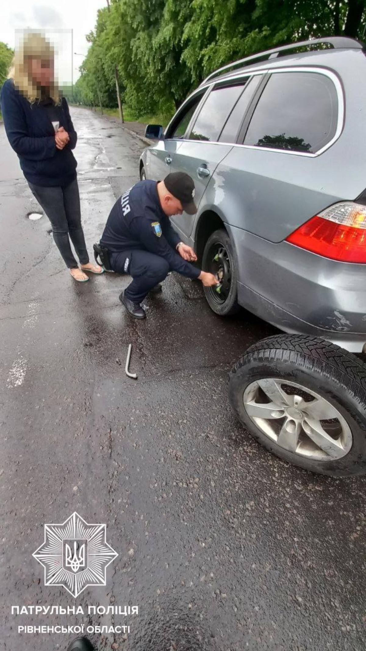 Поліцейські замінили жінці колесо, яке було пошкоджено, та супроводили до найближчого шиномонтажу.