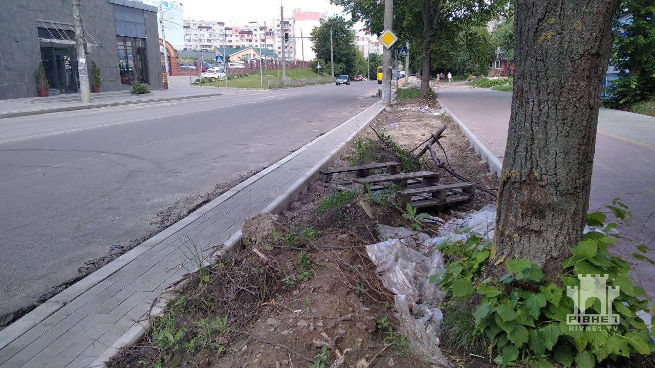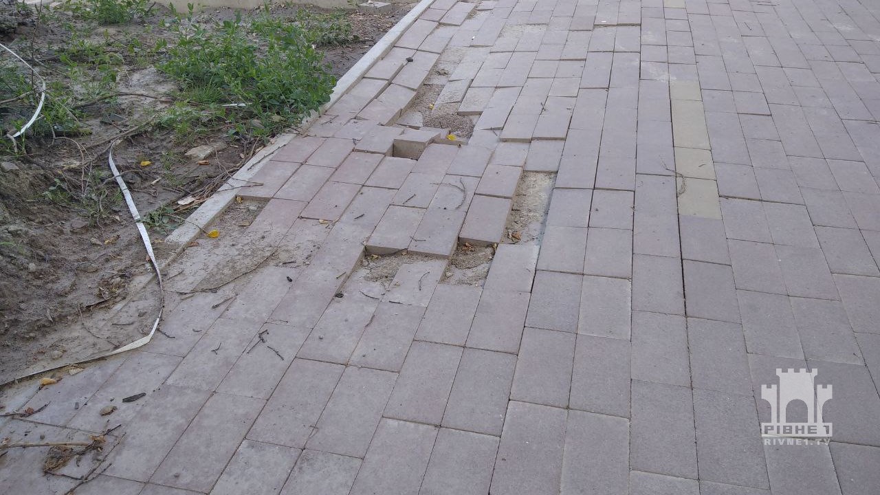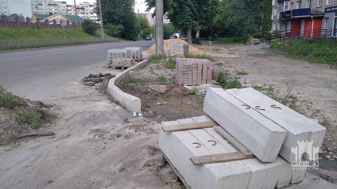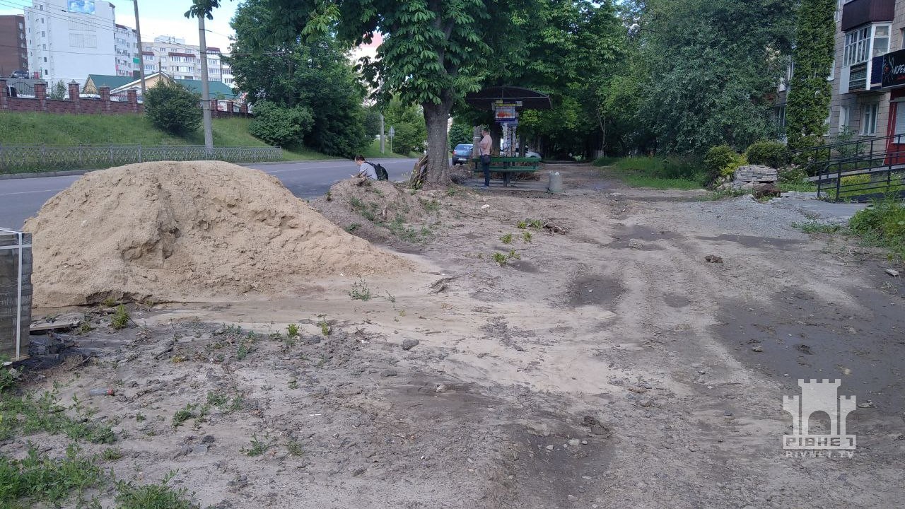 Зупинка на вулиці Корольова вже близько року у неналежному стані, так само і доріжки для пішоходів – викорчувані дерева, купи будматеріалів вздовж відремонтованих доріжок, і місцями - просто відсутня бруківка, про що раніше розповідали журналісти "Рівне 1". На окремих ділянках навіть покладена минулого року бруківка почала просідати.