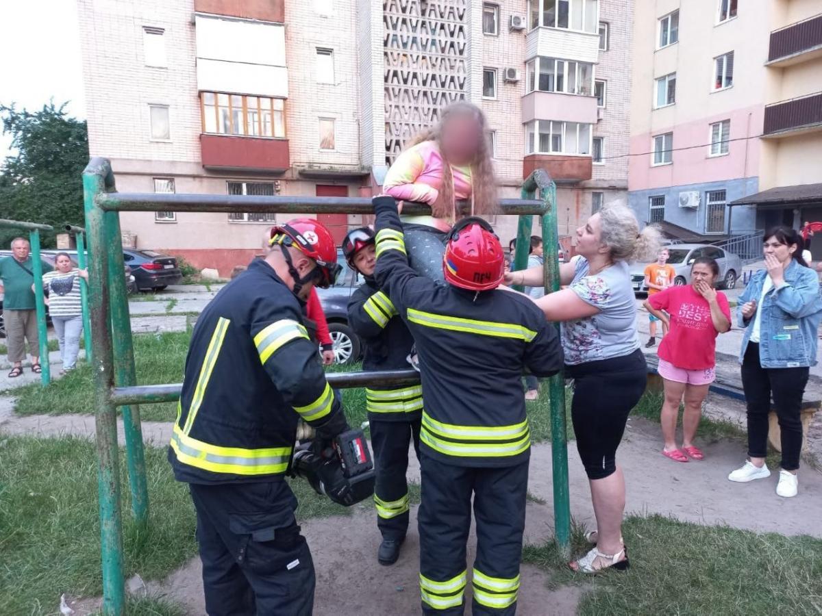 Дівчинка, бавлячися, хотіла перелізти між металевими стовпчиками та застрягла. Самотужки звільнитися не змогла, не допомогли й дорослі, що були поруч.