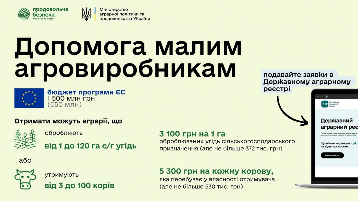 «Малі сільгоспвиробники зможуть скористатися підтримкою Євросоюзу, щоб вже цієї осені розпочати посівну, закупити корми, відремонтувати техніку тощо. Зі свого боку Мінагрополітики створило всі умови для швидкої та безпечної виплати цієї допомоги. Прийом заявок відбувається онлайн через Державний аграрний реєстр. Процес прийняття рішень є простим і прозорим. Водночас Міністерство працює над розширенням програм підтримки в Державному аграрному реєстрі, тому закликаю всіх сільгоспвиробників реєструватися в системі та слідкувати за оновленнями», – зазначив Міністр аграрної політики та продовольства України Микола Сольський.