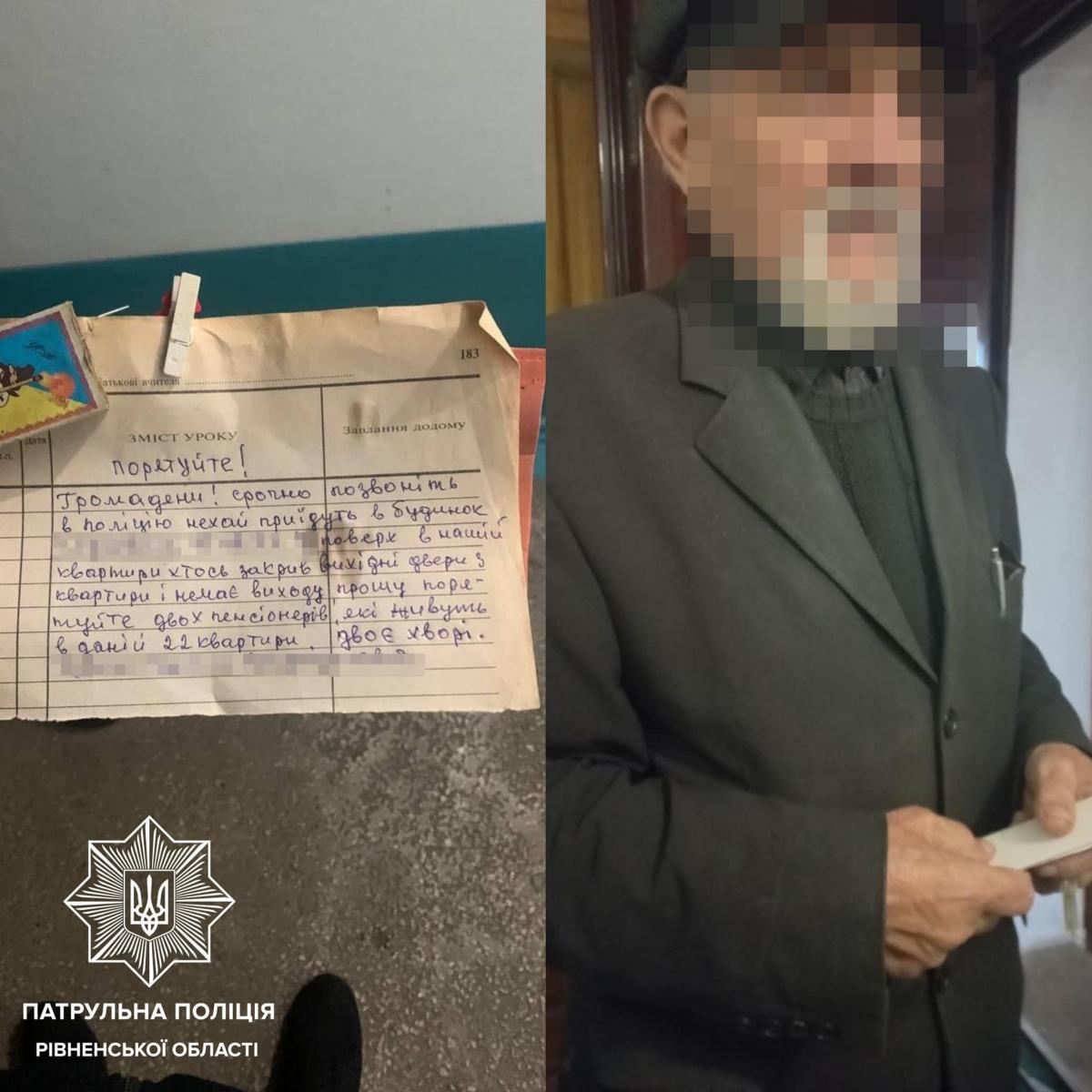 Інспектори, які прибули на місце, виявили рівнянина похилого віку. Оскільки в дідуся були вади слуху, він скинув з балкона записку. У ній він написав, що в квартирі заклинив замок, який не може відчинити, повідомляє патрульна поліція Рівненщини.