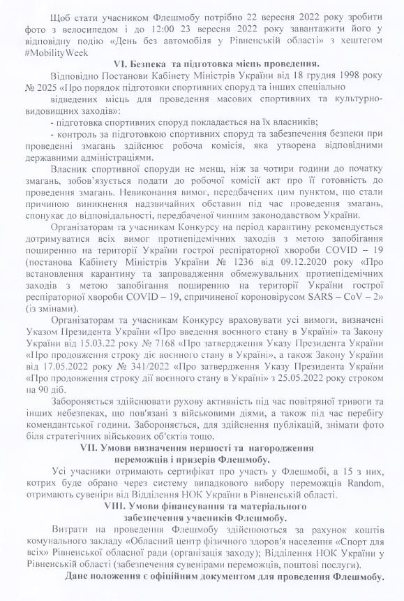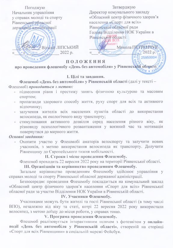 З нагоди Дня без автомобіля комунальний заклад «Обласний центр фізичного здоров’я населення «Спорт для всіх» Рівненської обласної ради за підтримки Відділення НОК України в Рівненській області організовує флешмоб.