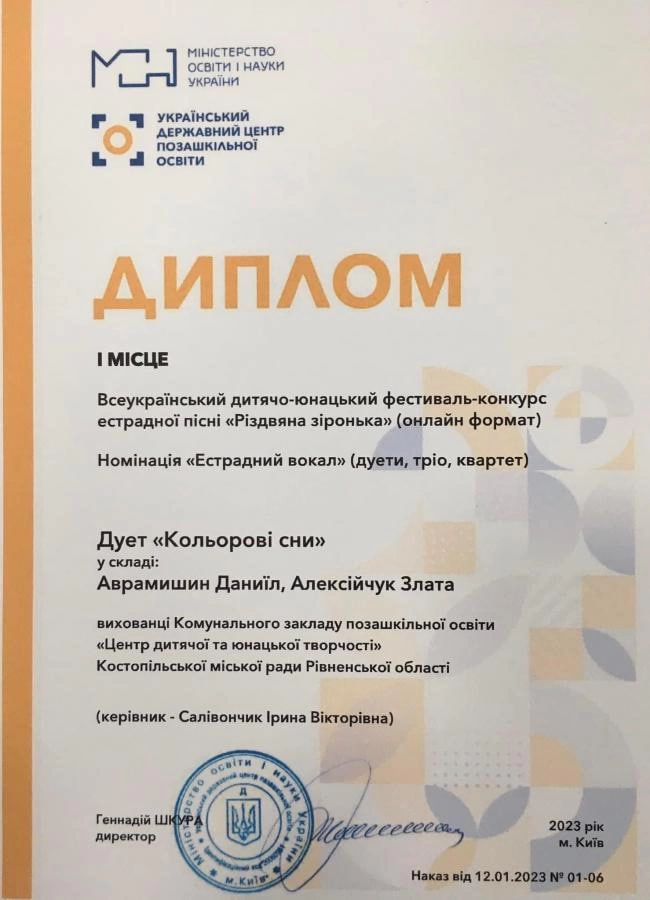 Вихованці вокальної студії «Кольорові сни» Злата Алексійчук та Даниїл Аврамишин з Костополя посіли почесне 1 місце у Всеукраїнському дитячо-юнацькому конкурсі естрадної пісні «Різдвяна зіронька».