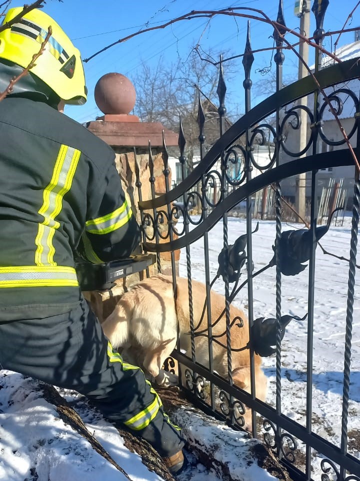 На Рівненщині рятувальники звільнили чотирилапого з металевої огорожі.