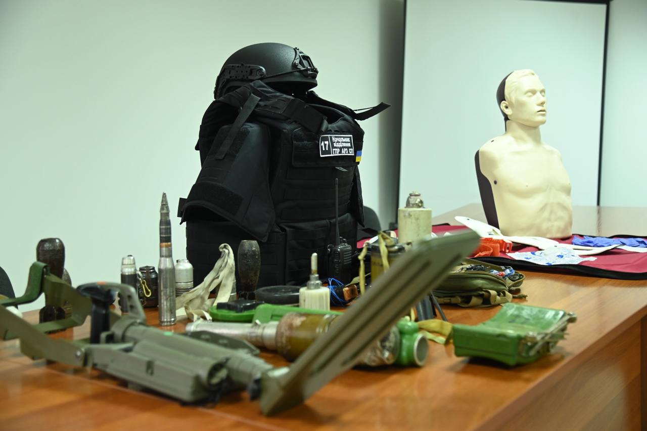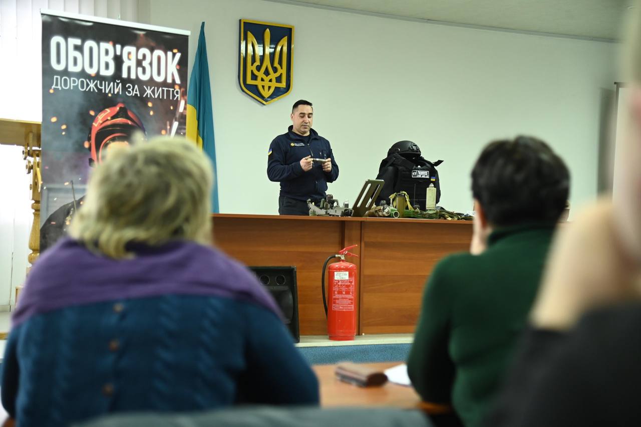 Працівник групи піротехнічних робіт аварійно-рятувального загону спеціального призначення ГУ ДСНС в області ознайомив учасників заходу з муляжами вибухонебезпечних предметів та розповів основні правила поведінки при виявленні вибухонебезпечних предметів.