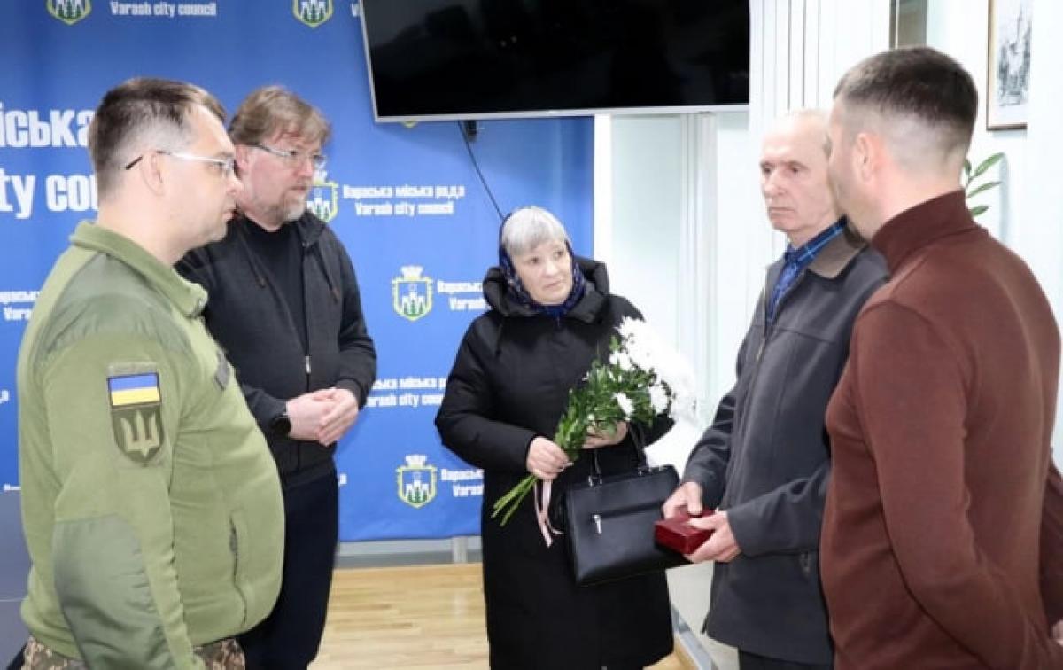 Нагороду батькам Героя Скібчик Лідії Пилипівні та Скібчику Василю Миколайовичу сьогодні вручили міський голова м.Вараш Олександр Мензул та начальник Вараського РТЦ та СП підполковник Андрій Скляров.