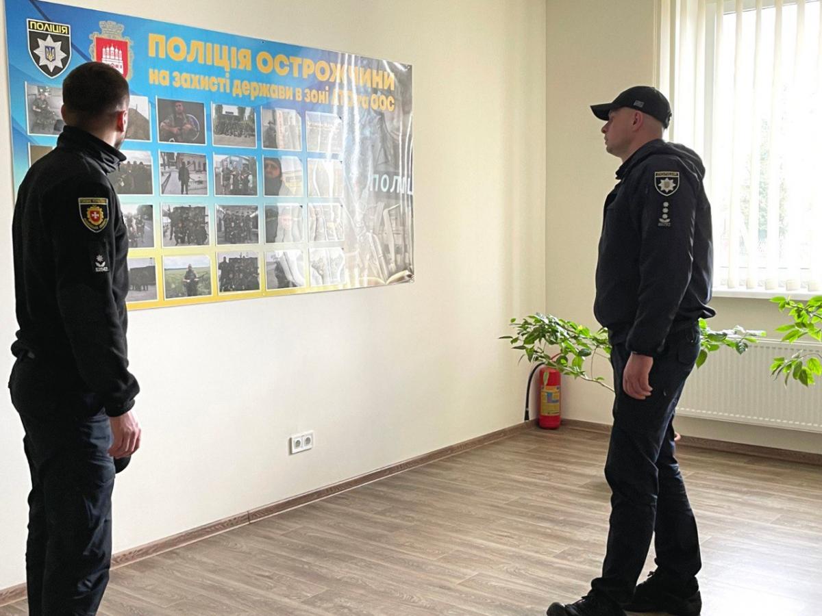 У відділенні поліції №3 (м. Острог) Рівненського РУП очільник поліції області познайомився з особовим складом, оглянув укриття та приміщення укомплектованого спортивного залу: він повноцінно розпочав свою роботу, тож поліцейські активно тут тренуються.