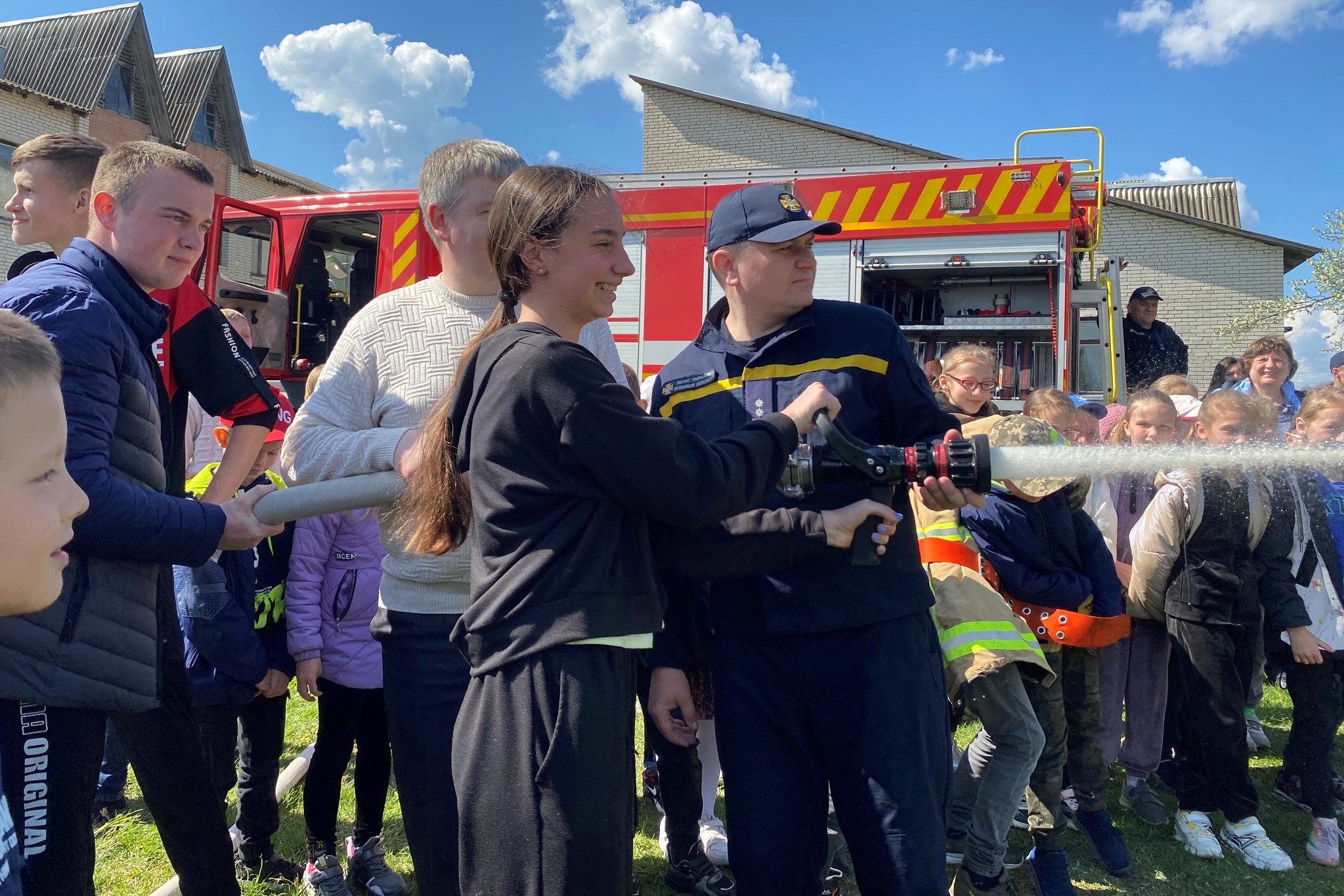 Приміряти захисний костюм, спробувати повправлятися з пожежним стволом, відчути на собі масу балона зі стисненим повітрям та багато з чим іншим мають змогу ознайомитися діти.