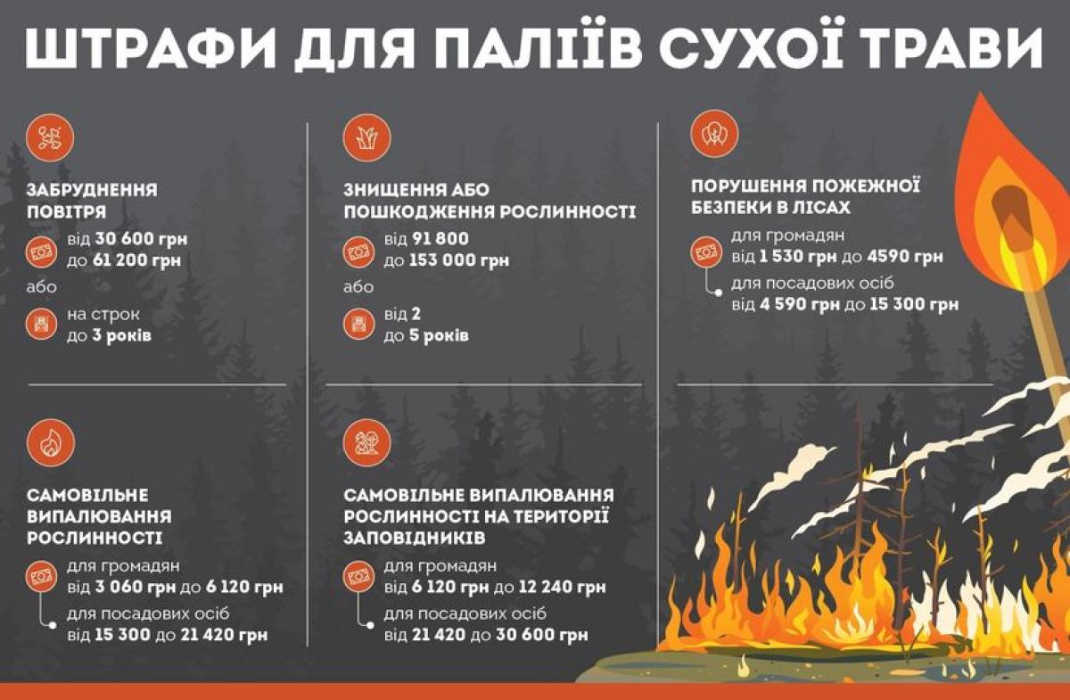 Згідно зі статтею 77-1 КУпАП за самовільний підпал трави передбачений штраф: