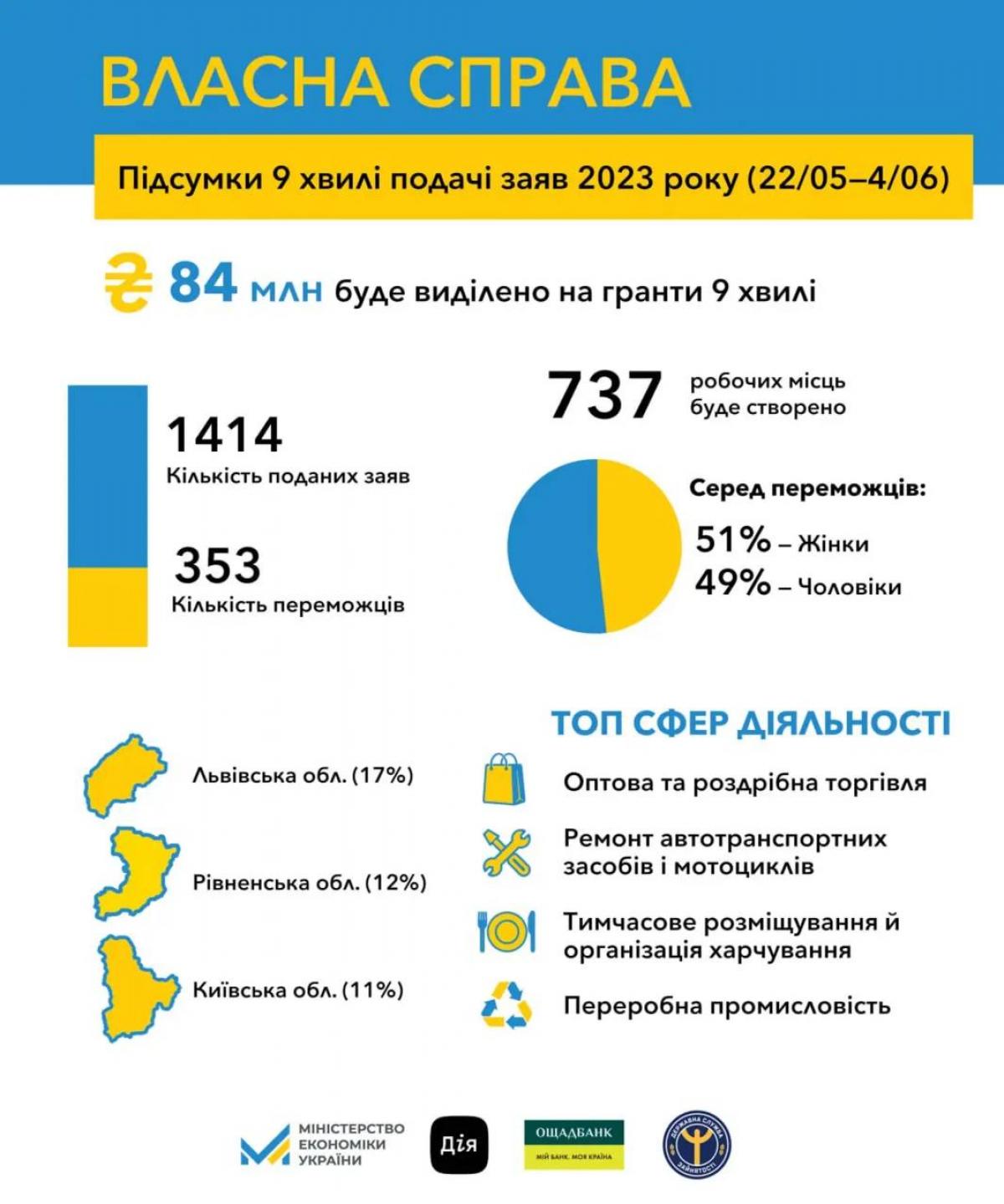 «Рівненщина посідає друге місце з-поміж всіх регіонів України по кількості переможців за результатами дев’ятої хвилі цьогорічної грантової програми «єРобота: Своя справа». Загалом у 2023 році гранти отримають 254 учасники програми з Рівненської області на загальну суму 62,2 млн гривень. Для реалізації їх підприємницьких ініціатив буде створено 501 нове робоче місце», - повідомив Віталій Коваль.