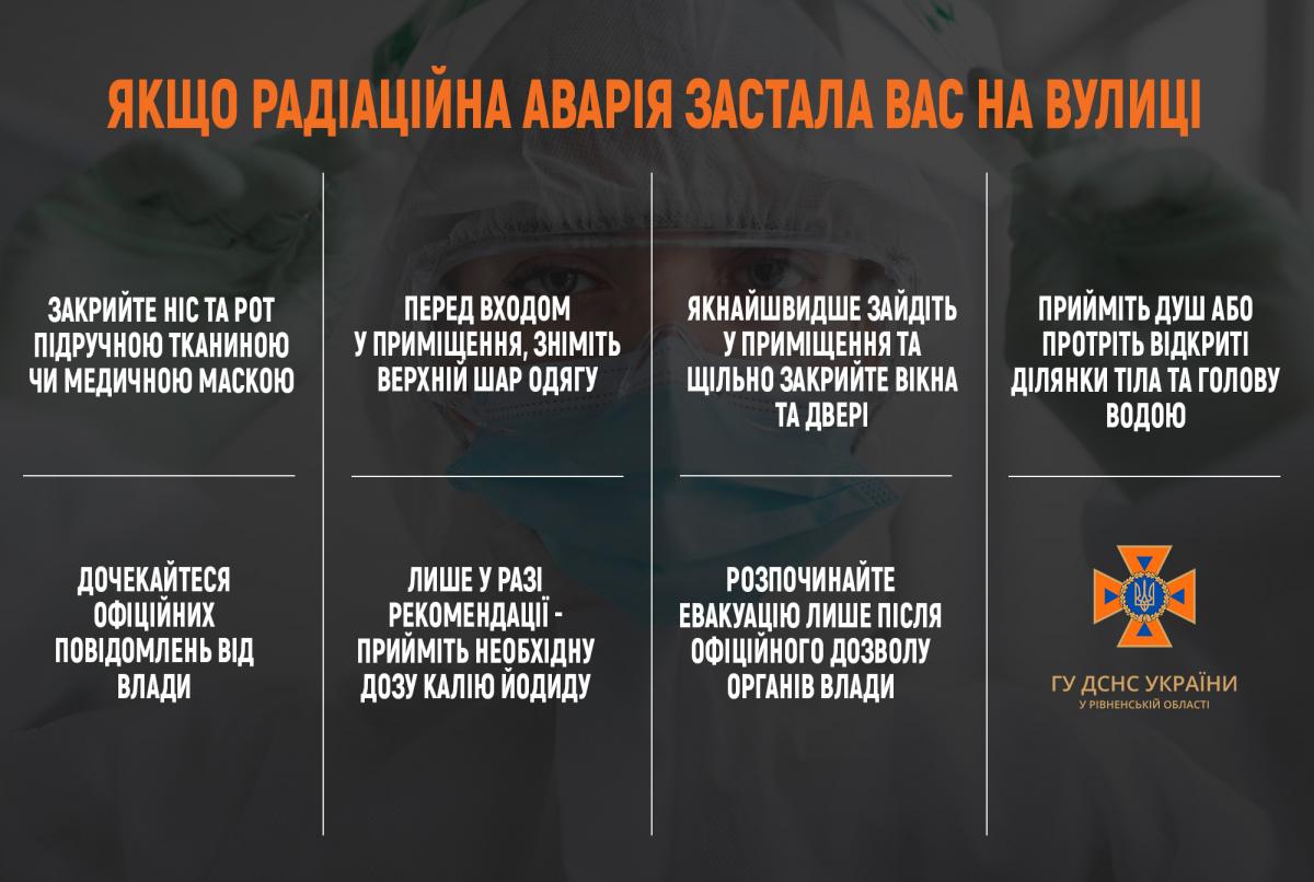 - По-перше, необхідно терміново захистити органи дихання. Для цього підійде будь-яка підручна тканина, складена у кілька шарів, або захисна маска. Це допоможе частково зменшити потрапляння радіоактивного пилу в організм.