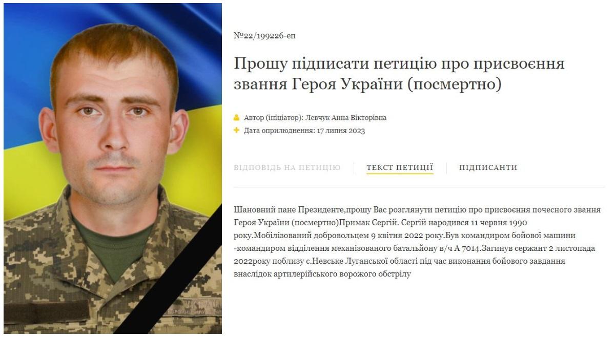 Прошу Вас розглянути петицію про присвоєння почесного звання Героя України (посмертно) Примаку Сергію... Мобілізований добровольцем 9 квітня 2022 року.Був командиром бойової машини -командиром відділення механізованого батальйону в/ч А 7014.Загинув сержант 2 листопада 2022року поблизу с.Невське Луганської області під час виконання бойового завдання внаслідок артилерійського ворожого обстрілу, - написали автори петиції.