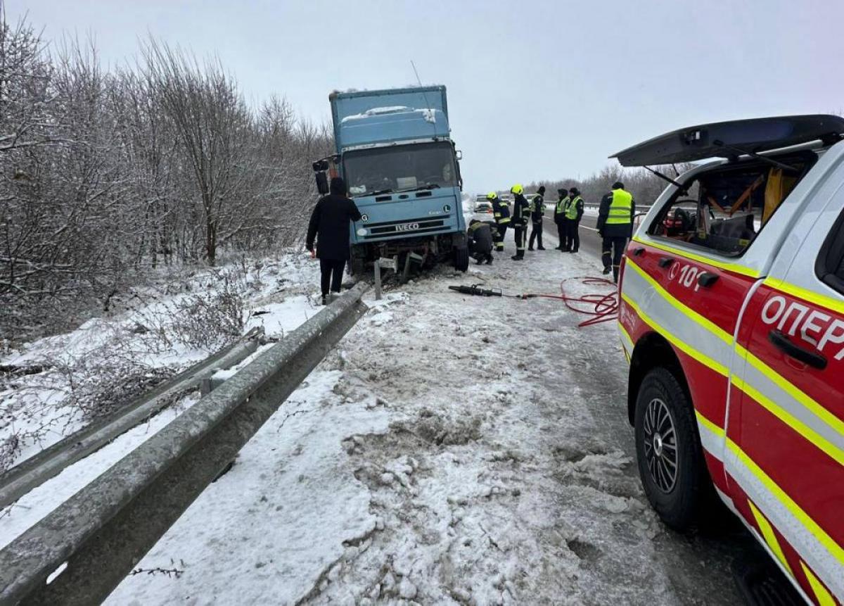 Рятувальники деблокували вантажівку з дорожнього відбійника на трасі Київ-Чоп.