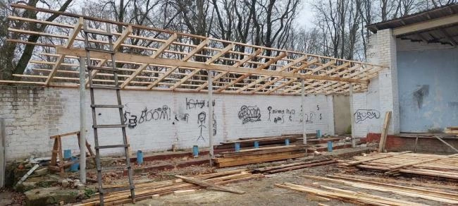 У Тучині тривають ремонтні роботи на літньому майданчику «Кошара». Уже виконано заміну покрівлі даху та піднавісу, проводять облаштування фасаду. До робіт активно долучаються місцеві мешканці, військовослужбовці та комунальники.