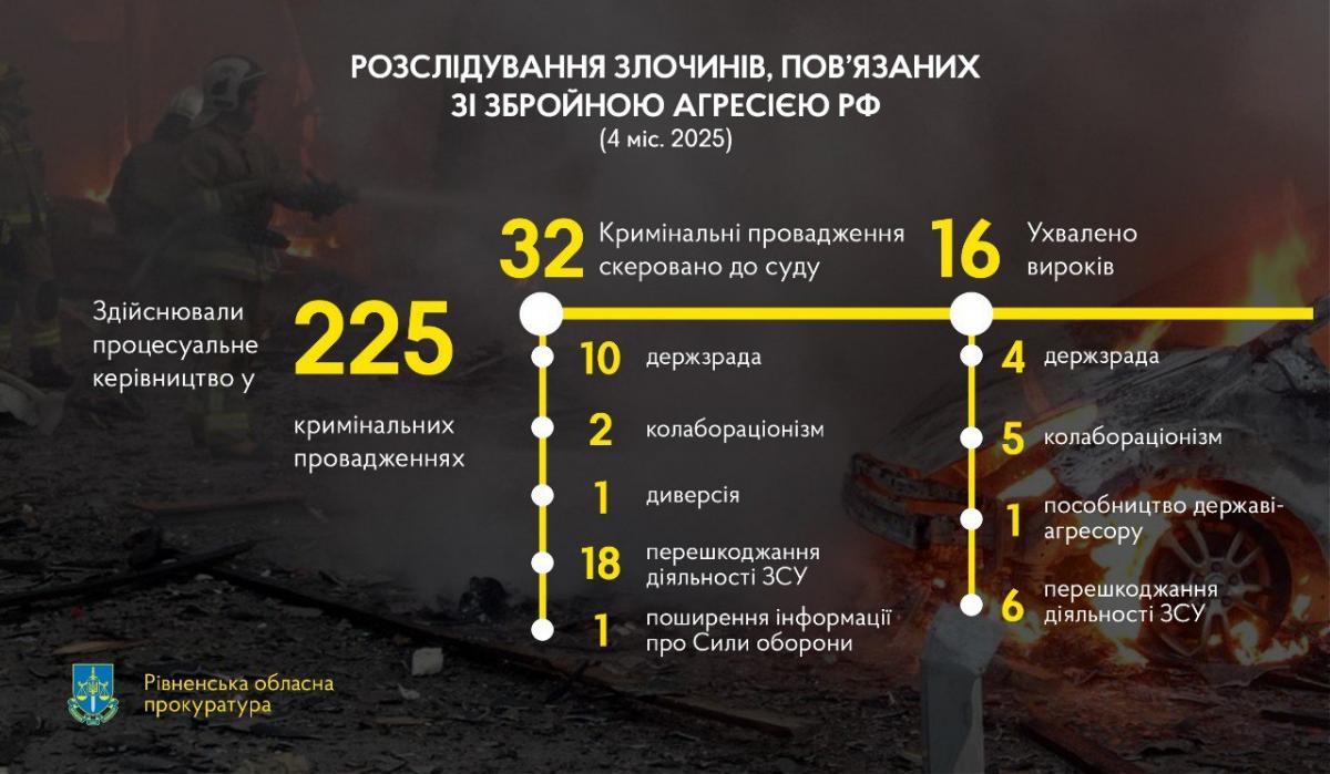 За цей час завершено досудове розслідування та до судів Рівненщини скеровано 32 кримінальні провадження для розгляду по суті. Серед них 10 – за фактами державної зради, 2 – щодо колабораційної діяльності, 18 – стосовно перешкоджання діяльності ЗСУ та ще по 1 – за фактом диверсії та поширення інформації про Сили оборони.
