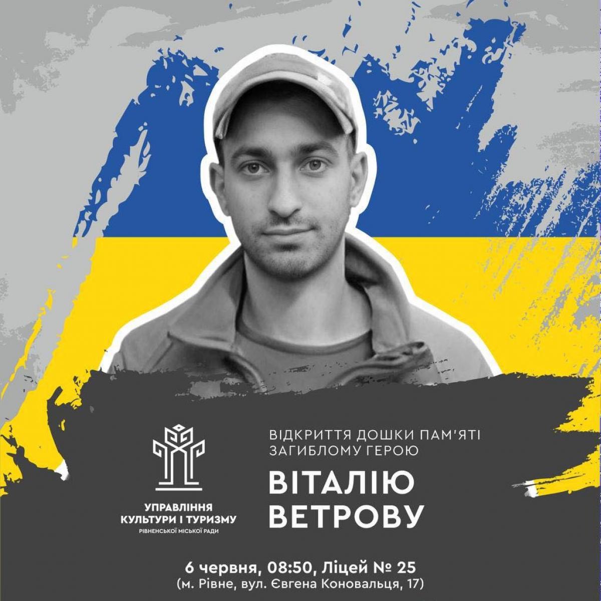 Завтра, шостого червня, о 8:50, на фасаді Рівненського ліцею №25 відбудеться відкриття дошки пам’яті загиблому Герою Віталію Ветрову, - повідомляють в Рівненській міській раді.