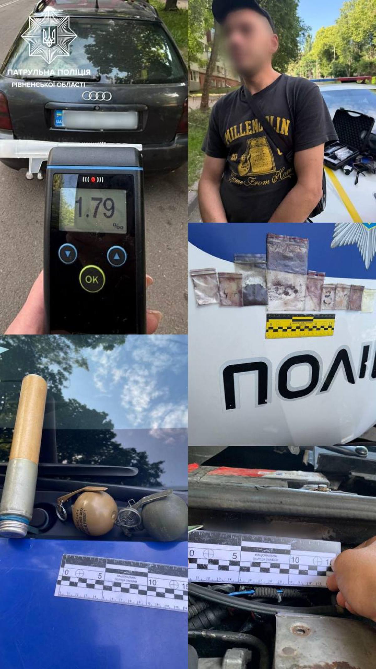 В салоні ми виявили зіп пакети, ймовірно з прекурсорами для виготовлення наркотичних речовин, та один зіп пакет із залишками кристалоподібною речовиною, зовні схожою на наркотичну, а на задньому сидінні інспектори помітили наплічну сумку, в якій знаходилися предмети, зовні схожі на бойові гранати та предмет, зовні схожий на сигнальну хімічну ракету, - повідомляє патрульні поліція Рівненщини.