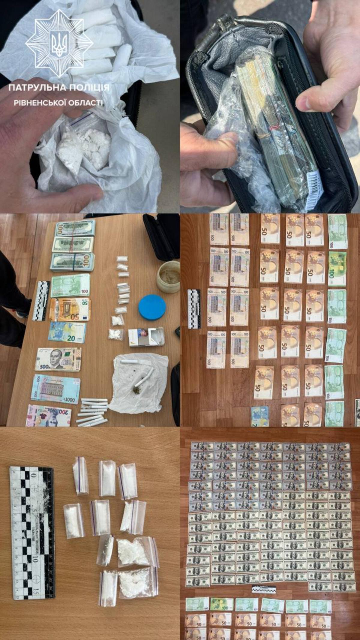 В салоні 53-річного керманича патрульні виявили 12 штук поліетиленових пакетиків з білою кристалічною речовиною, зовні схожою на наркотичну, а також ваги, пусті поліетиленові пакетики та готівку в сумі близько 30 тисяч доларів.