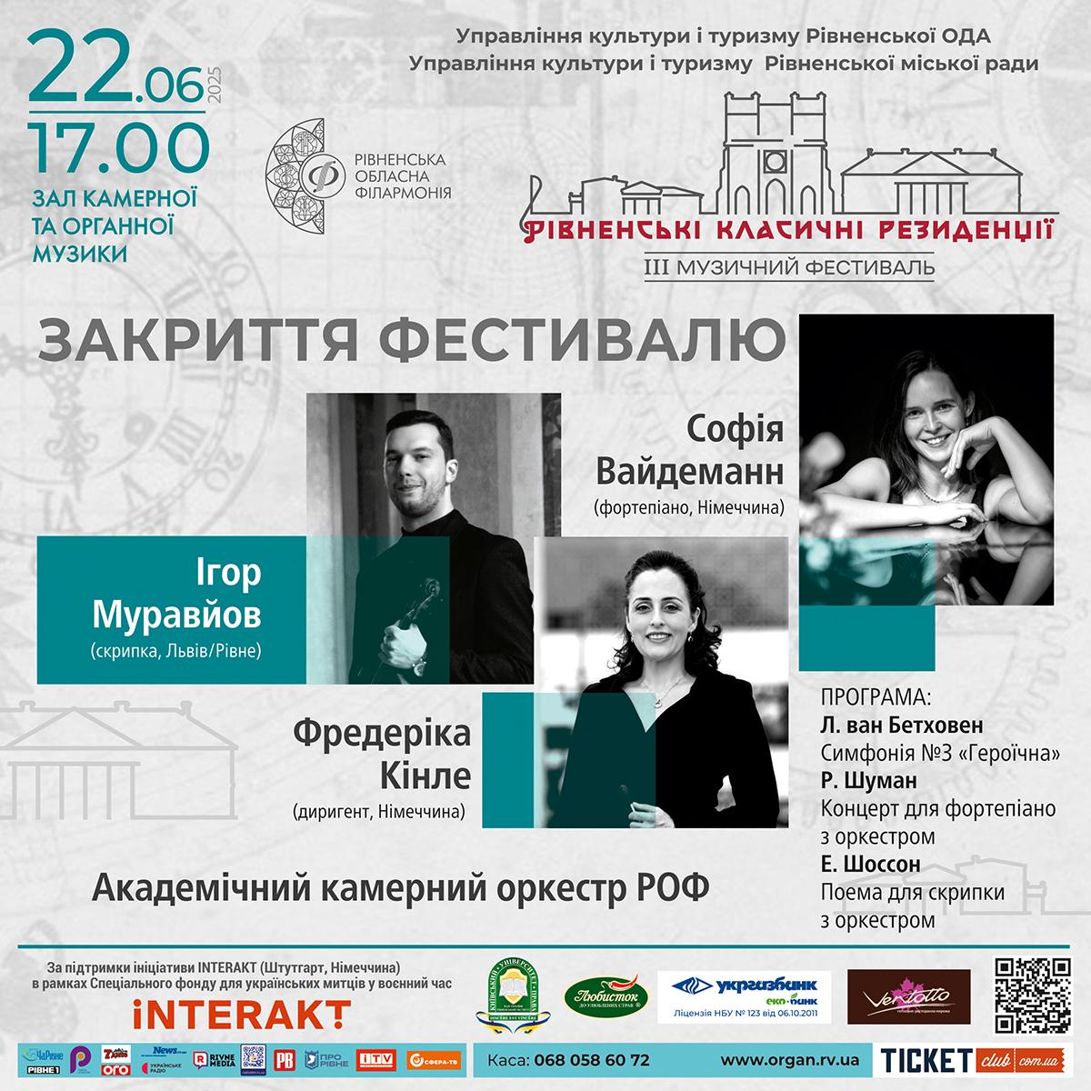 Ми чекаємо на блискучий склад солістів - це німецька піаністка Софія Вайдеманн та український скрипаль, диригент Академічного камерного оркестру РОФ Ігор Муравйов. До Рівного прибудуть також запрошені оркестрові музиканти зі Львова, Тернополя і Луцька, аби симфонічні полотна зазвучали на повну міць.