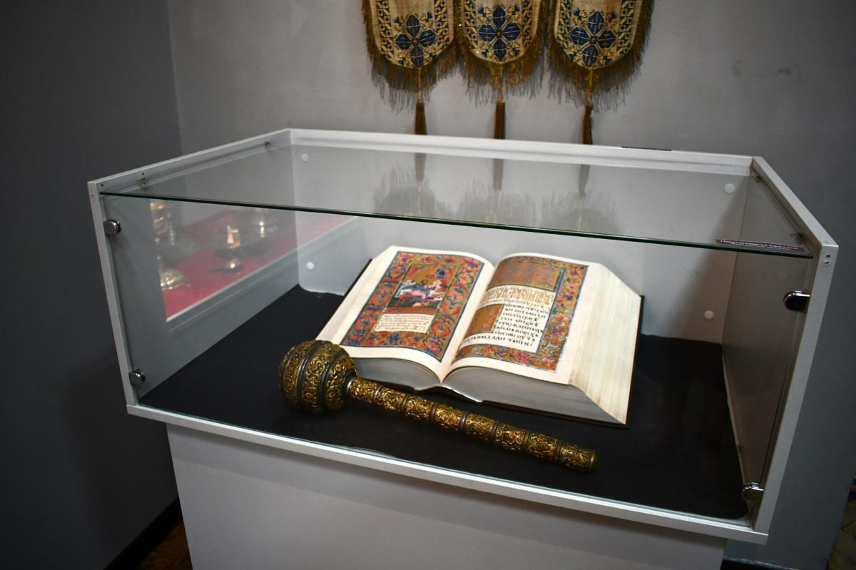 Перша експозиція представляє сакральні пам’ятки XVII–XIX ст.: стародавні ікони, напрестольні та натільні хрести, плащаницю, факсимільну копію Пересопницького Євангелія????. Серед експонатів – унікальні вишиті хоругви початку ХХ ст. у жовто-блакитних кольорах. Свого часу радянська влада їх вилучила з храму на Здолбунівщині через їхню національну символіку.