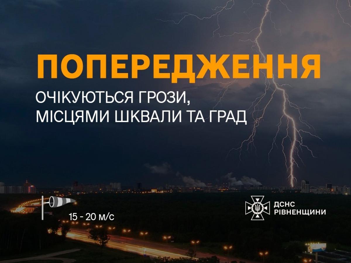 Сьогодні протягом доби, у Рівному та області очікуються дощі з грозою, місцями можливий град та шквали 15–20 м/с.
