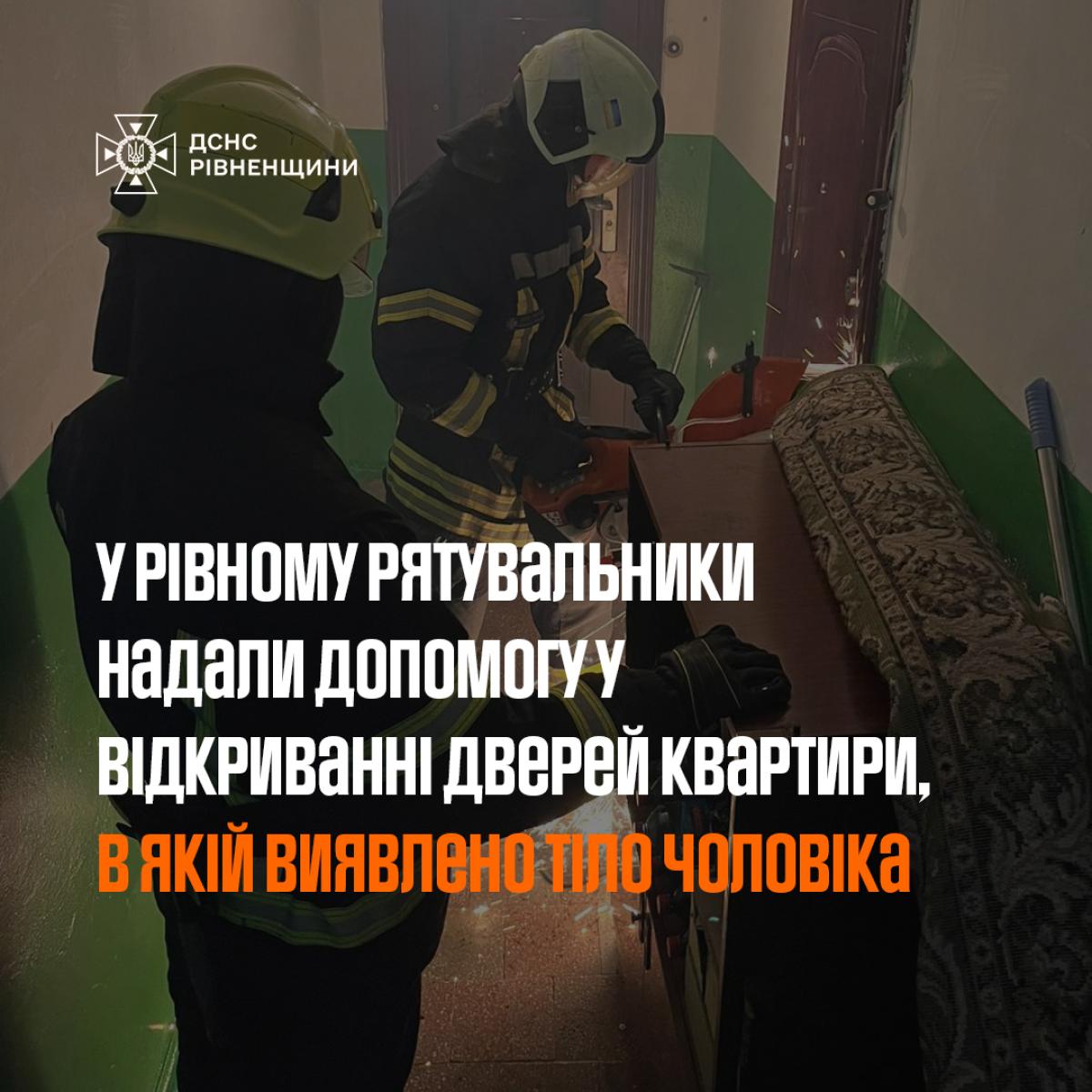 Рятувальники 3-ї державної пожежно-рятувальної частини за допомогою спеціального інструменту відкрили вхідні двері квартири на прохання працівників поліції. У помешканні було виявлено мертве тіло чоловіка — 1964 року народження.
