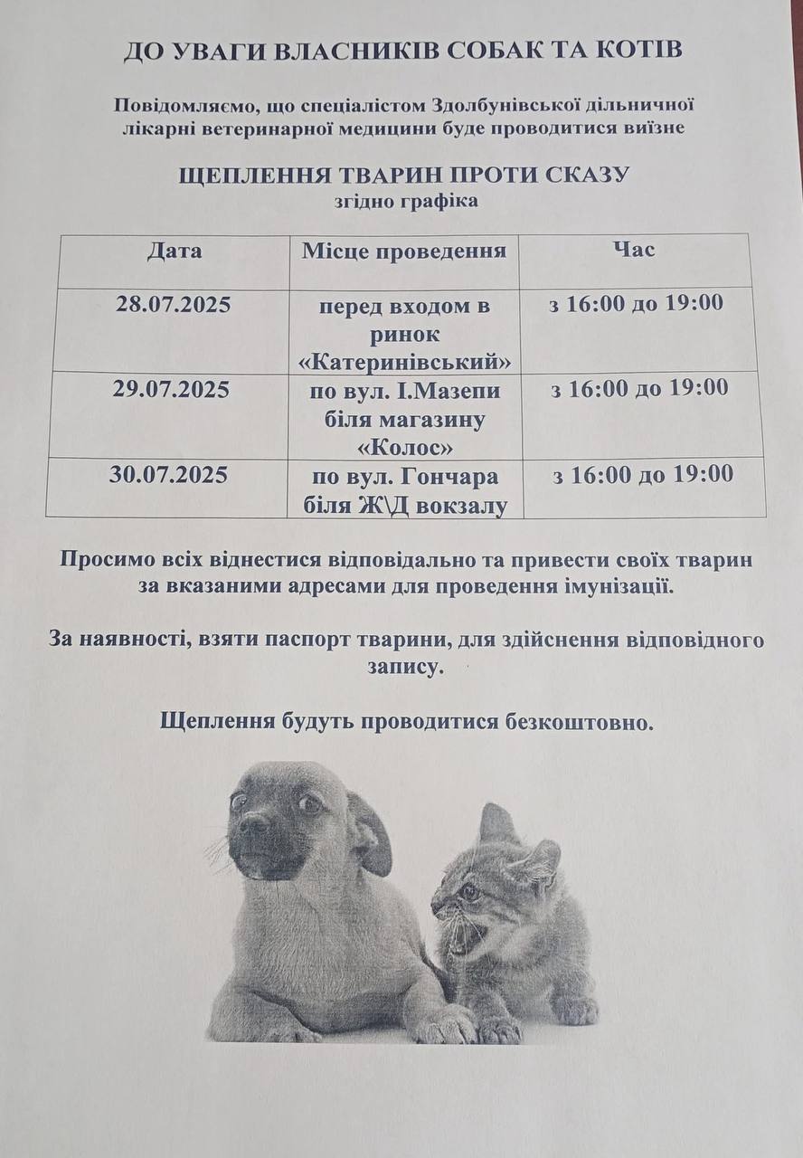 Просимо всіх віднестися відповідально та привести своїх тварин за вказаними адресами для проведення імунізації.