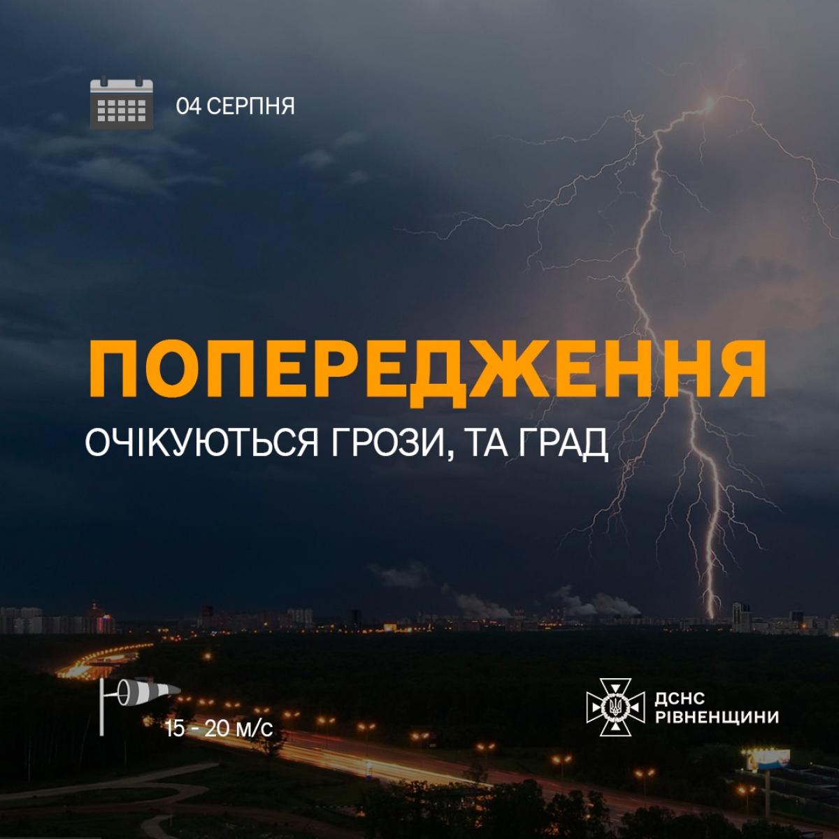 За інформацією Рівненського обласного центру з гідрометеорології четвертого серпня очікуються грози, місцями шквали 15-20м/с та град.